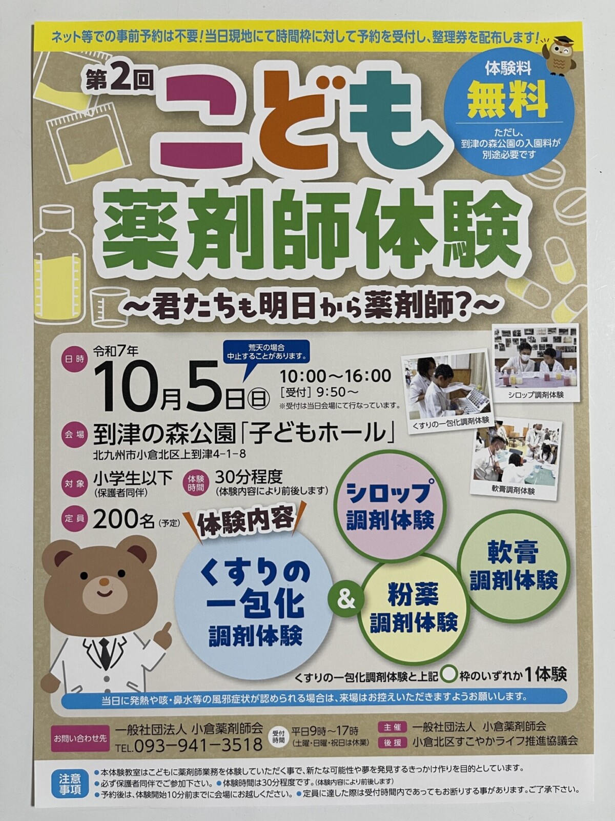到津の森公園(北九州市小倉北区上到津4-1-8)の子どもホールで10月5日、「こども薬剤師体験」が開催されます。