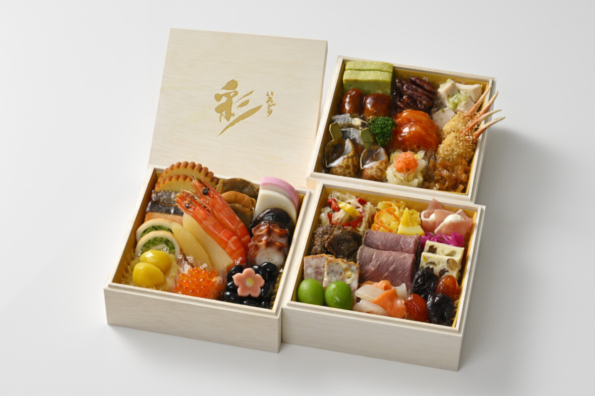 壱之重には、北海道産帆立旨煮や伊達巻、有頭海老、栗きんとんなど、縁起の良い和風の品々がずらり。弐之重では、ローストビーフやスモークサーモンマリネなど、贅沢な味わいの洋風料理がラインナップしています。