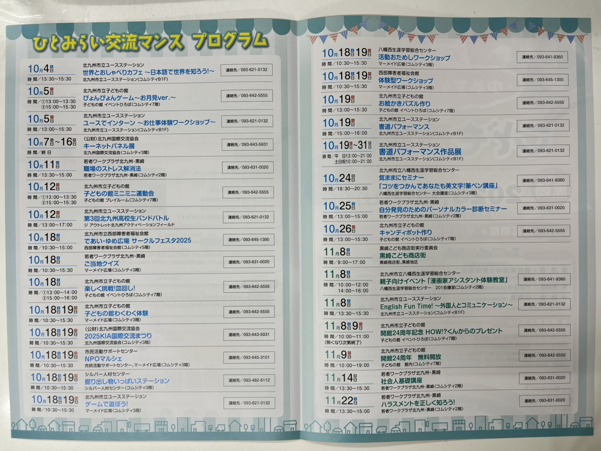 イベントの日時と場所は、<ひとみらい交流マンス プログラム>で見ることが可能。例えば、10月18日には「子どもの館わくわく体験」、11月8日には「黒崎こども商店街」が行われます。