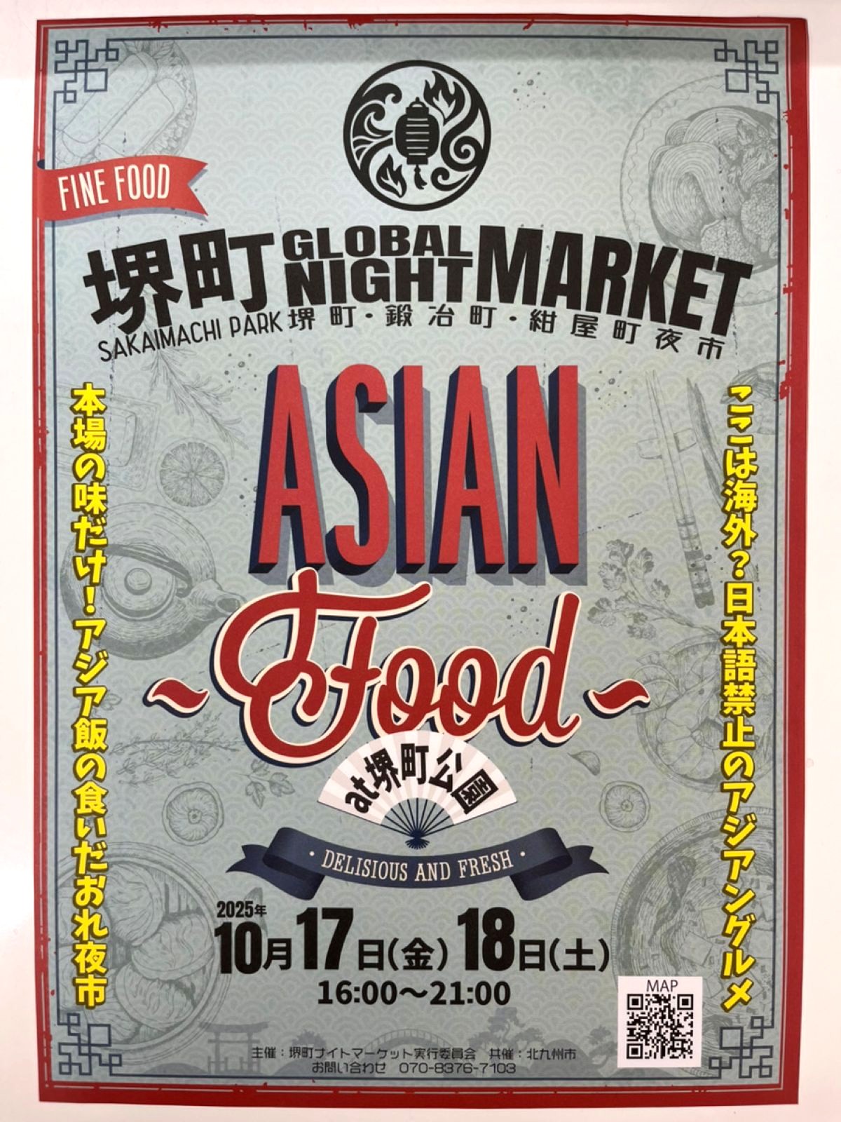 堺町公園(北九州市小倉北区堺町1-7)で10月17日と18日、アジア各国のグルメが味わえる「堺町NIGHT MARKET」が開催されます。