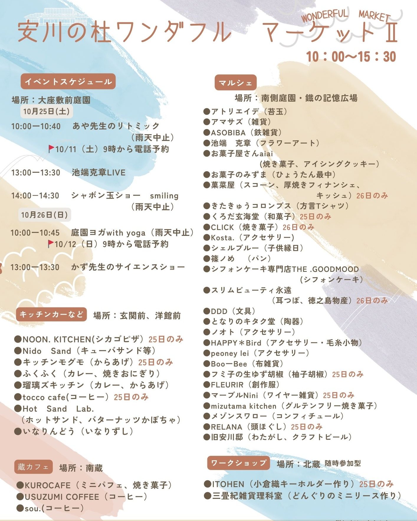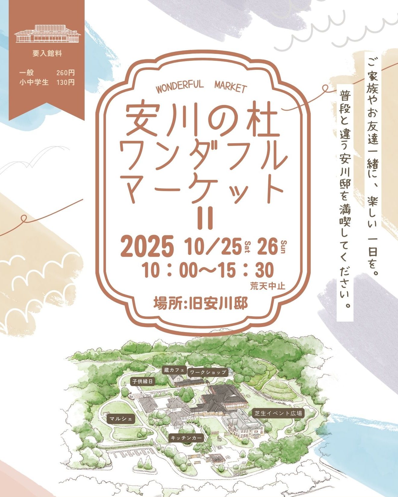 旧安川邸では、10月25日(土)と26日(日)に<安川の杜ワンダフルマーケットⅡ>を開催します。約40店舗のマルシェとキッチンカー、ワークショップコーナー、ステージ企画など盛りだくさんでお客様をお迎えします。お子様には縁日、大人の方にはクラフトビールもご用意しています。ご家族みなさんでいつもと違った安川邸をお楽しみください。