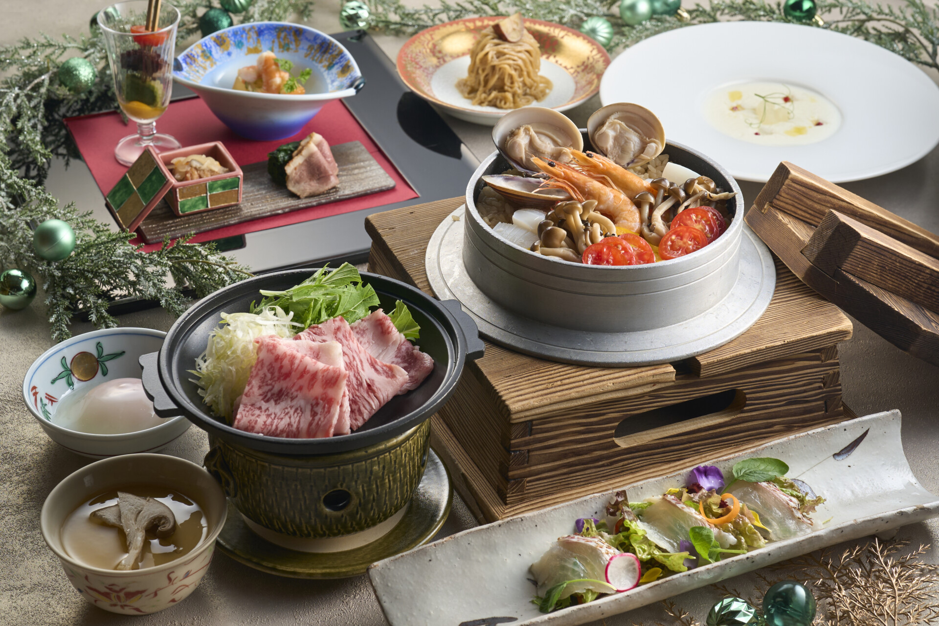 「皿倉」では、旬の食材と職人の技で魅せる、和の贅沢なひととき。ランチ限定の「クリスマスランチ」では、国産牛ロース焼きすきや豆乳で上品に仕立てた蕪のポタージュ。