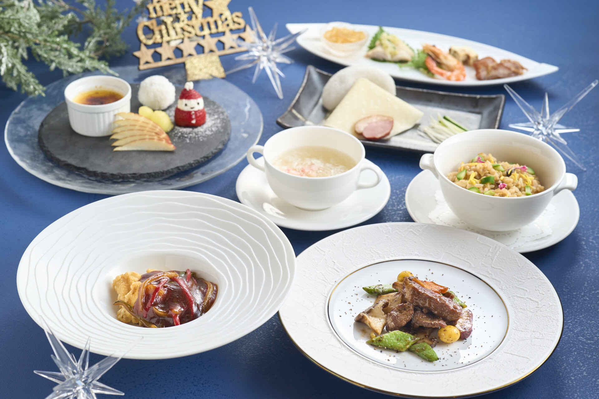同ホテル2階に位置する「オールデイダイニング リートス」では、冷製料理から温製料理、デザートまで、シェフこだわりの多彩なメニューが魅力。握り寿司やパエリア、マルセイユ風ブイヤベースなど、クリスマスにふさわしいご馳走が並びます。