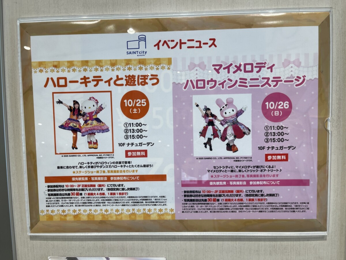 セントシティ10階のナチュガーデンで10月25日と26日、サンリオキャラクター「ハローキティ」や「マイメロディ」が登場するイベントが開催されます。