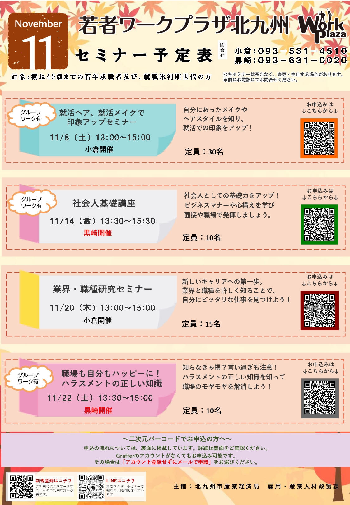 若者ワークプラザ北九州 11月のセミナー予定/北九州市 産業経済局 雇用・産業人材政策課