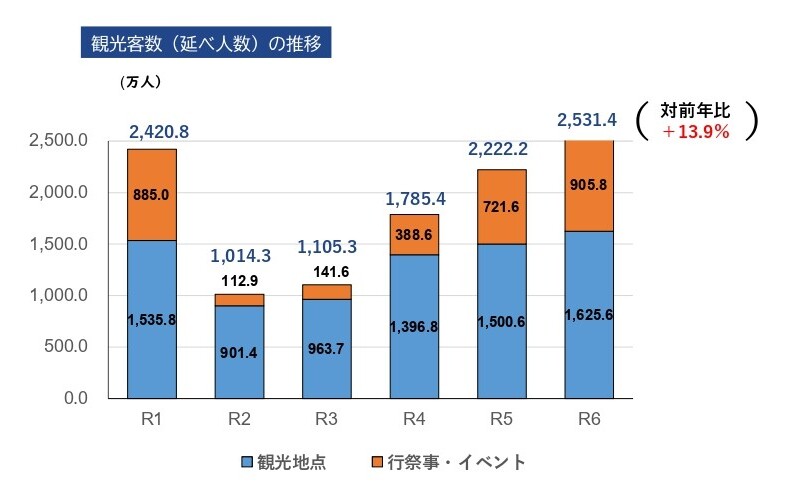 内訳は、観光地点を訪れた観光客数(延べ人数)が1625.6万人で対前年比8.3%増、行祭事・イベントを訪れた観光客数が905.8万人で同25.5%増といずれも増加。