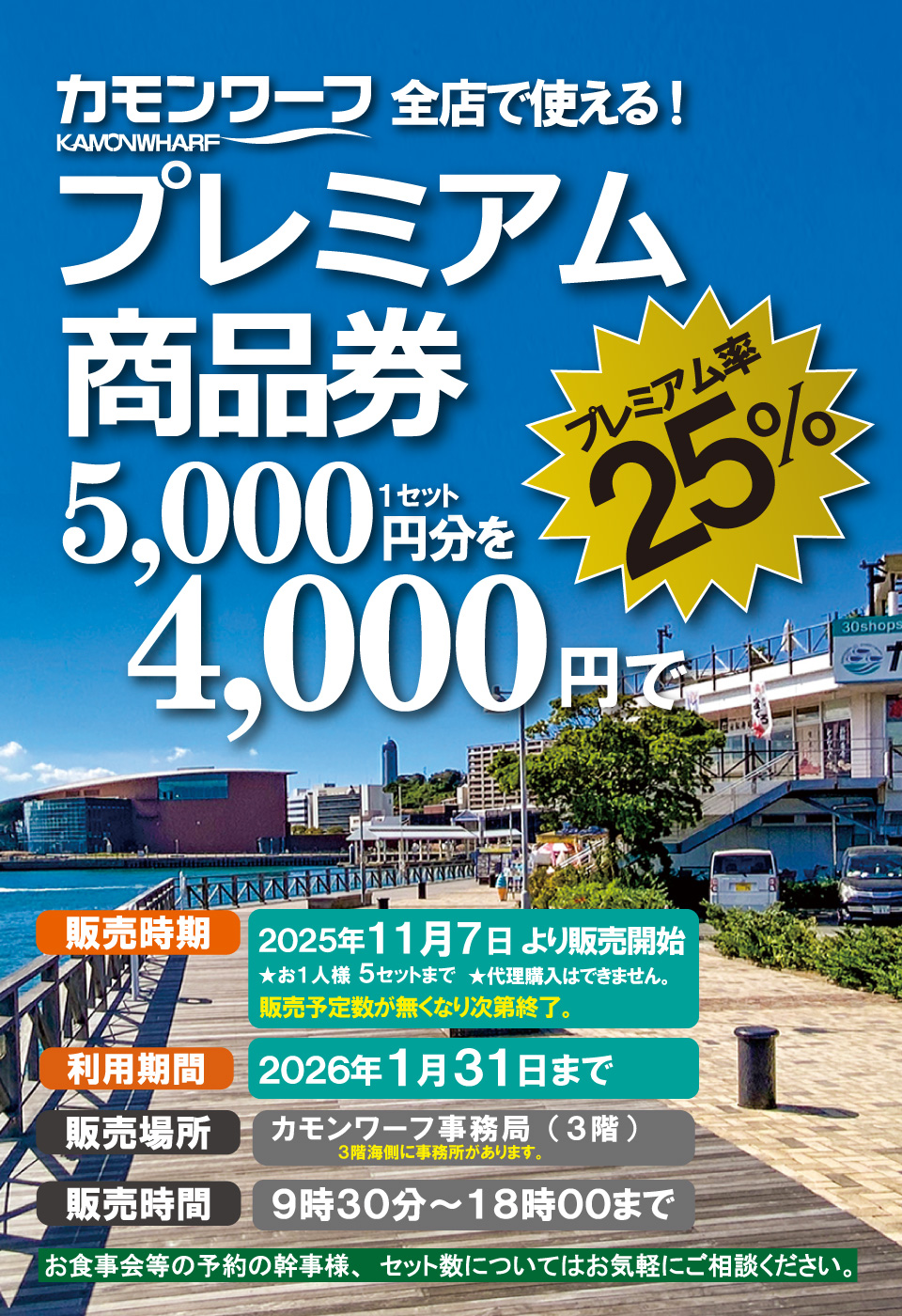 11月7日からカモンワーフ全店で使えるプレミアム商品券を販売中です!5000円分(1セット)を4000円でお買い求めいただけますので、プレミアム率はなんと25%!ぜひこの機会にご利用ください。