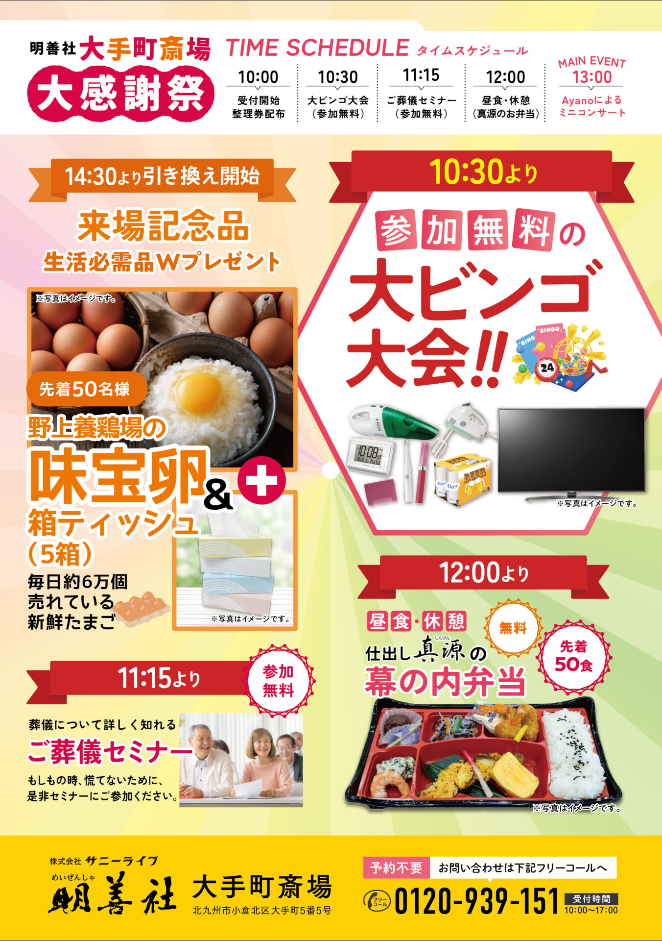 2025年11月30日(日)10:00~14:30、日頃のご愛顧に感謝を込めて、明善社 大手町斎場にて大感謝祭を開催いたします!★受付で「北九州ノコトを見た」とお伝えいただいた方には、 サニーライフォンオリジナルグッズをプレゼント★