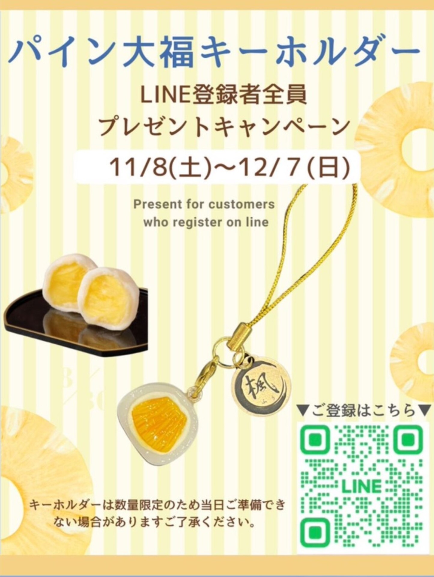 フルーツ大福屋の人気スイーツ「パイン大福」をモチーフにした手作りキーホルダーをプレゼントします!パインがとってもリアルな質感で、バッグやポーチにつけると注目度アップ間違いなし!皆様のご来店、心よりお待ちしております。