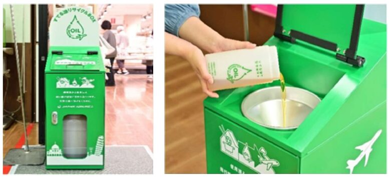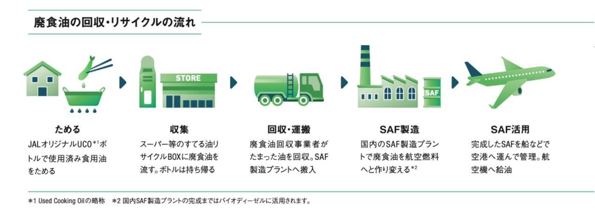 回収された廃食用油は、航空機の脱炭素化を進めるため、持続可能な航空燃料「SAF」に活用されるといいます。