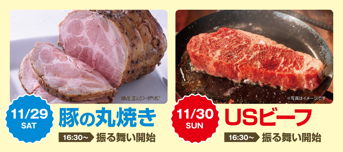 イベントのもう一つの目玉は、日替わりの“肉グルメ振る舞い”。両日とも先着100人限定で、無料の振る舞いが行われます。