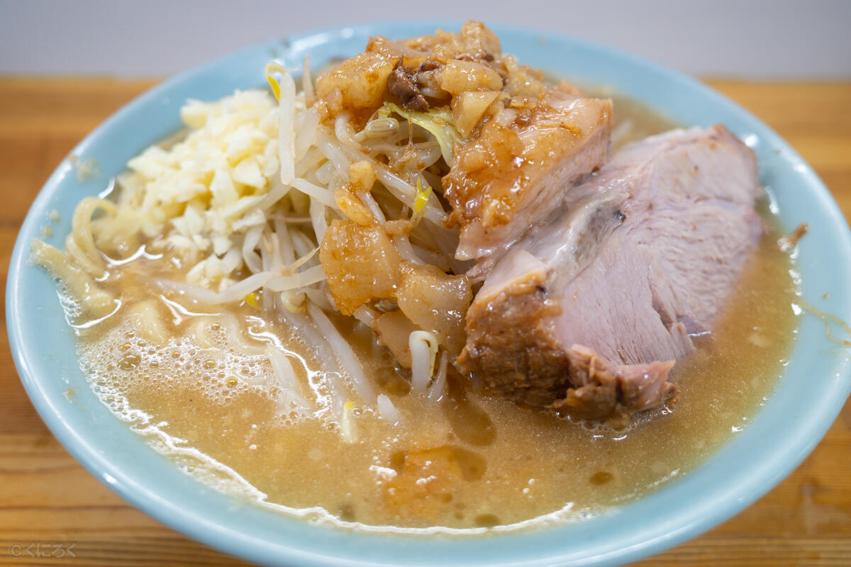 肉が大きく、にんにく・背脂・野菜がマシマシで豪快なラーメンです。