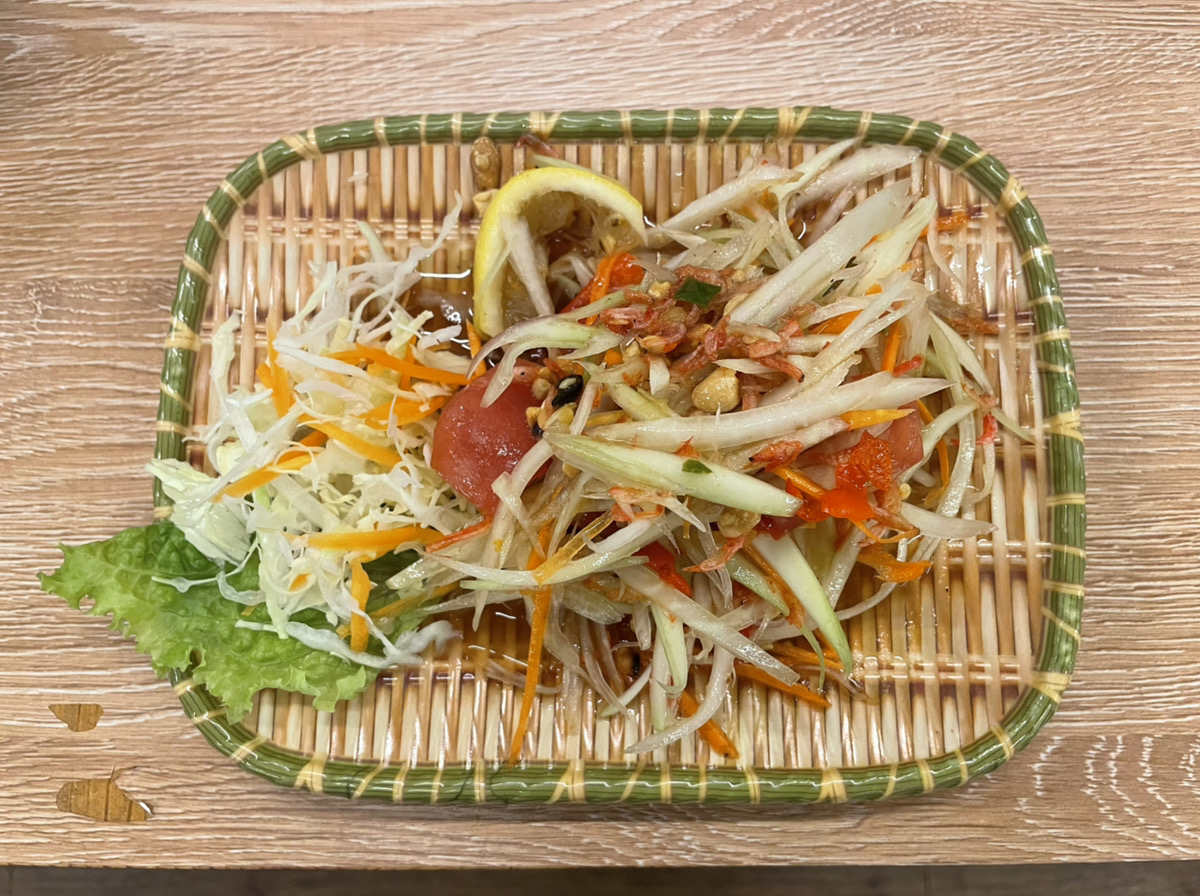 実は、タイ基準の辛さだったようで、全般的に料理の辛さは「普通」を選び、調味料で調節するのが無難だと分かりました。ちなみに、青パパイヤは青臭く無く、さわやかでシャキシャキとした食感が魅力です。