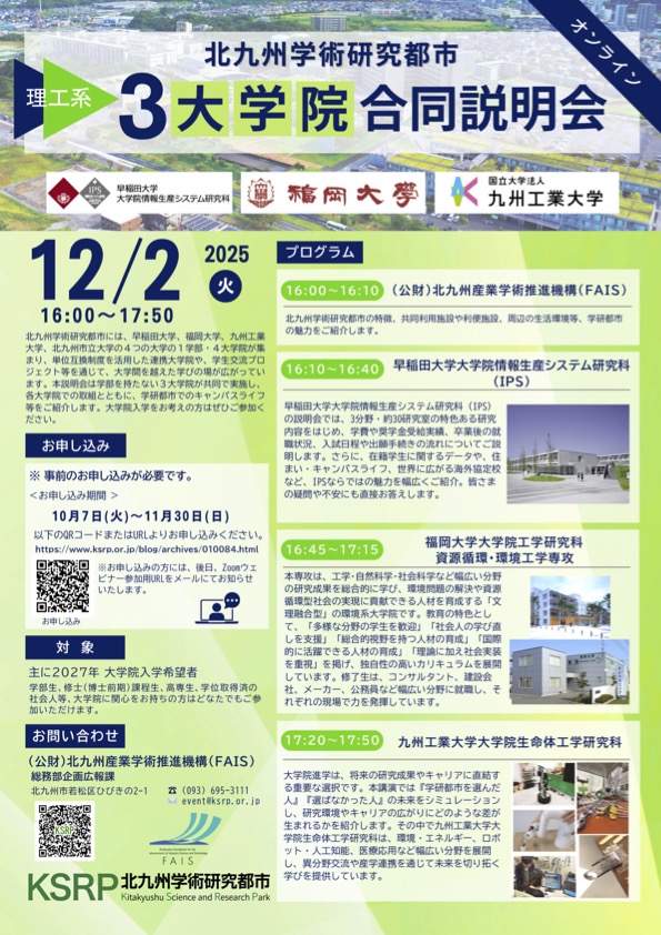 北九州学術研究都市は12月2日、オンラインで「3大学院合同説明会」を実施します。