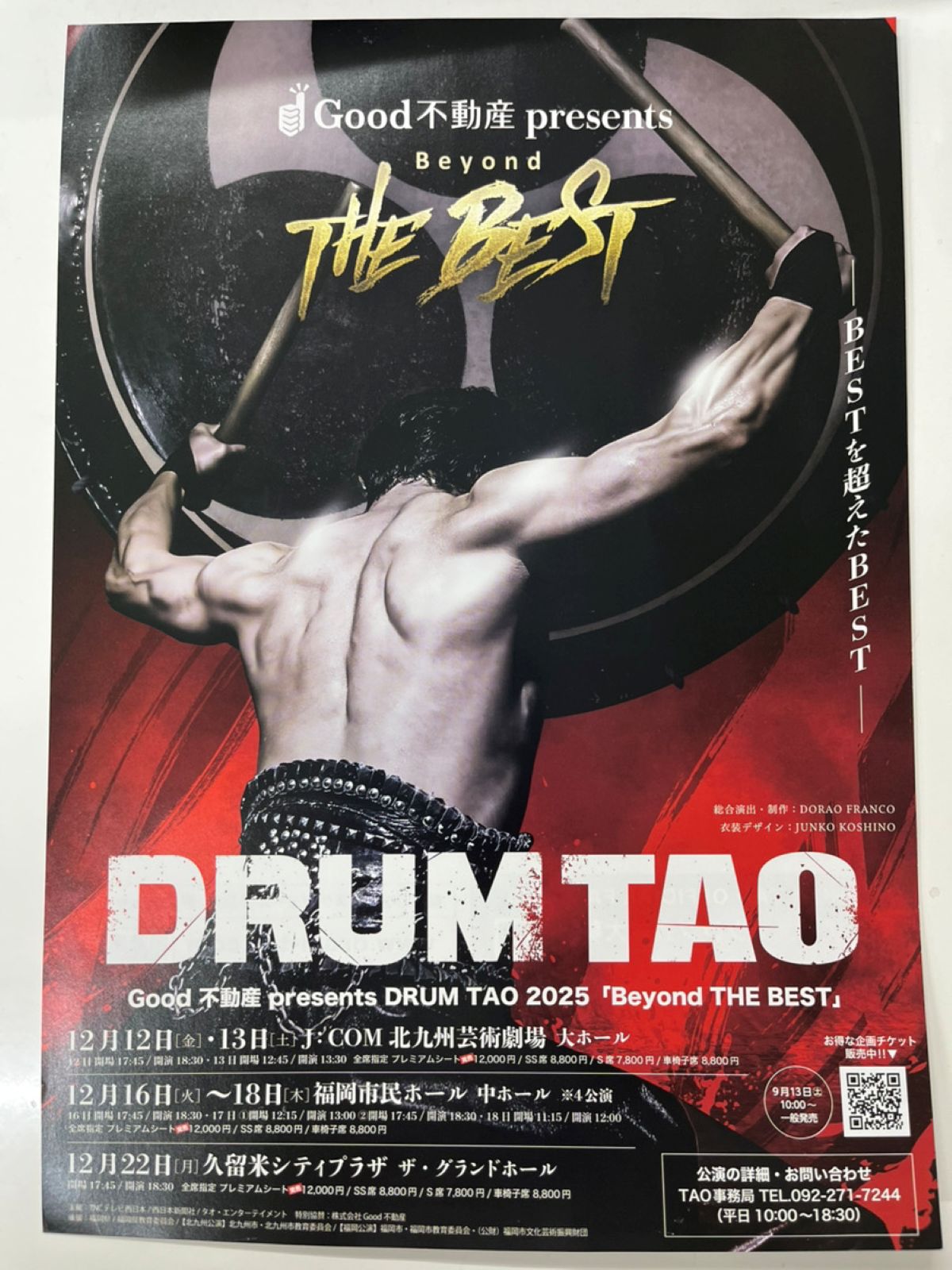 リバーウォーク北九州内のJ:COM北九州芸術劇場・大ホール (北九州市小倉北区室町1-1-1-11)で12月12日と13日の2日間、DRUM TAO 2025年12月九州ツアー「Beyond THE BEST」が開催されます。