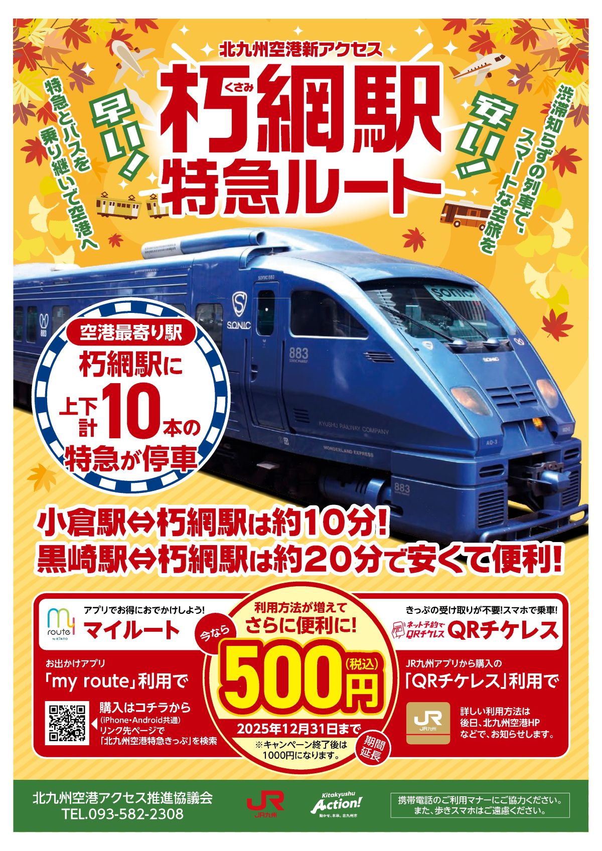 my routeアプリの「北九州空港特急きっぷ」キャンペーン期間は再延長が決定。 12月31日までは、キャンペーン価格の500円で利用できます。