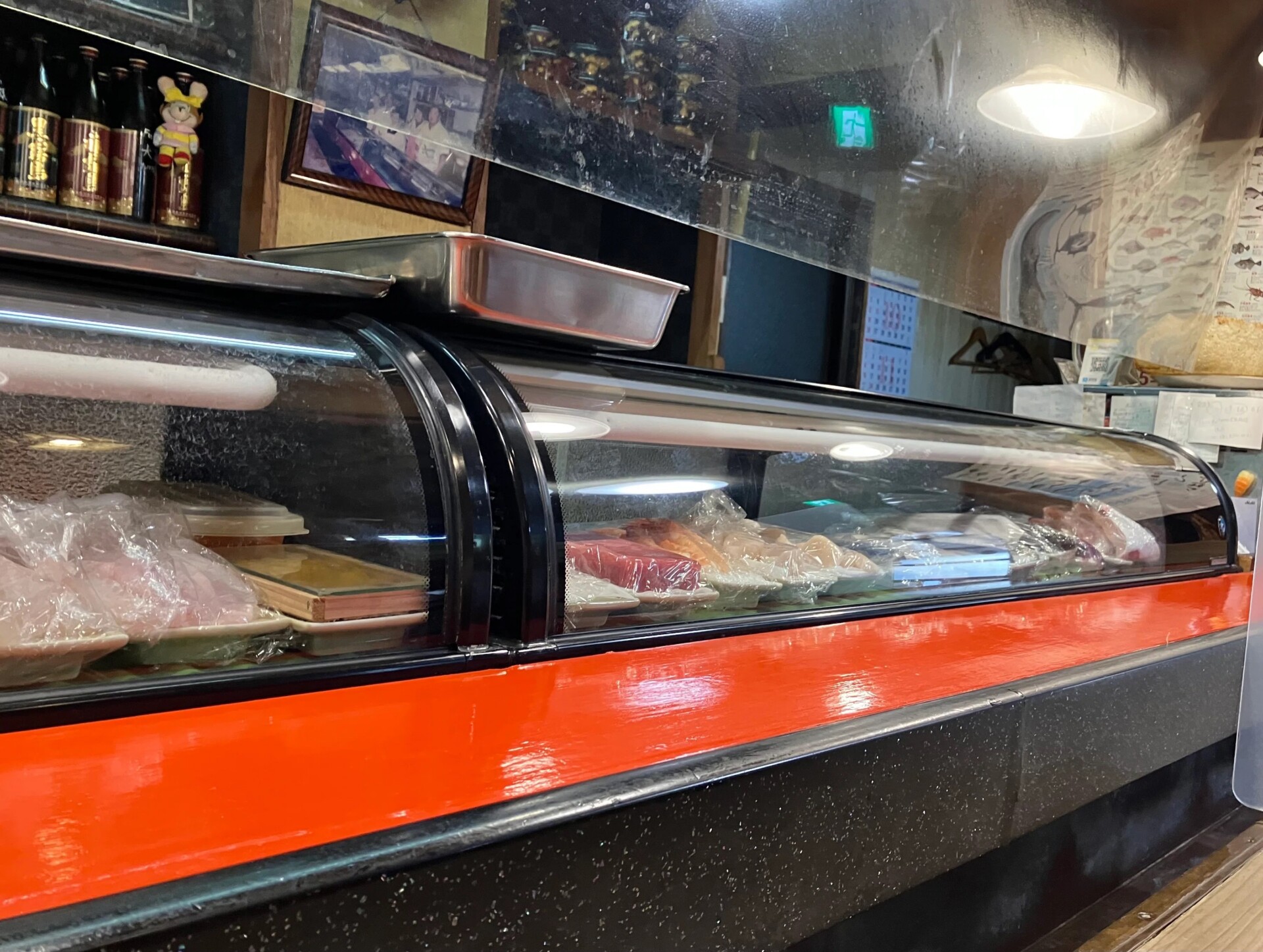 「よし竹寿司」の入り口を入ると、長いショーケースには新鮮なネタがずらり。店内はカウンター6席と小さなテーブル席があり、右手の階段を上がると座敷があります。
