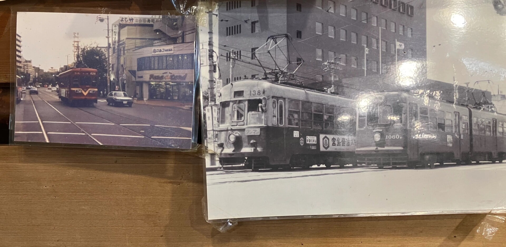店内には、店の前が路面電車の駅だった頃の街並みの写真や、店の歴史を感じさせるパネルが飾られています。