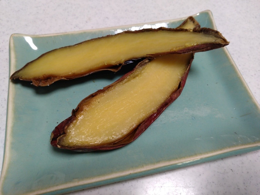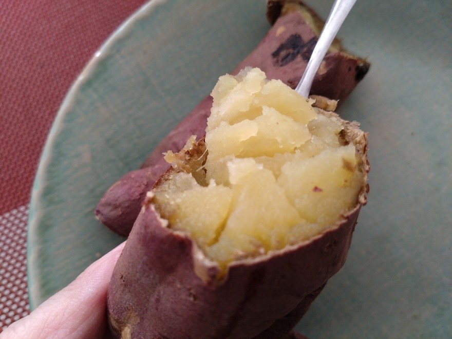 筆者は、焼きいもを縦や横に、自由なサイズに切り分けて食べてみました。