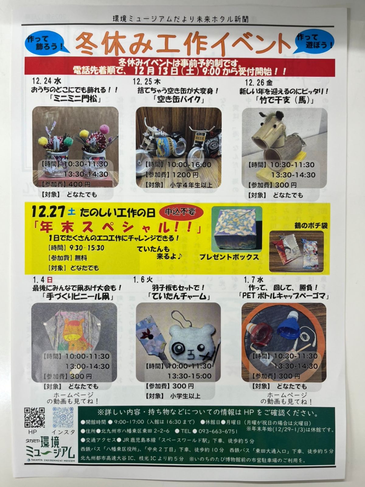 「タカミヤ環境ミュージアム」(北九州市八幡東区東田2-2-6)で12月24日〜1月7日の冬休み期間、日替わりで工作イベントが開催されます。