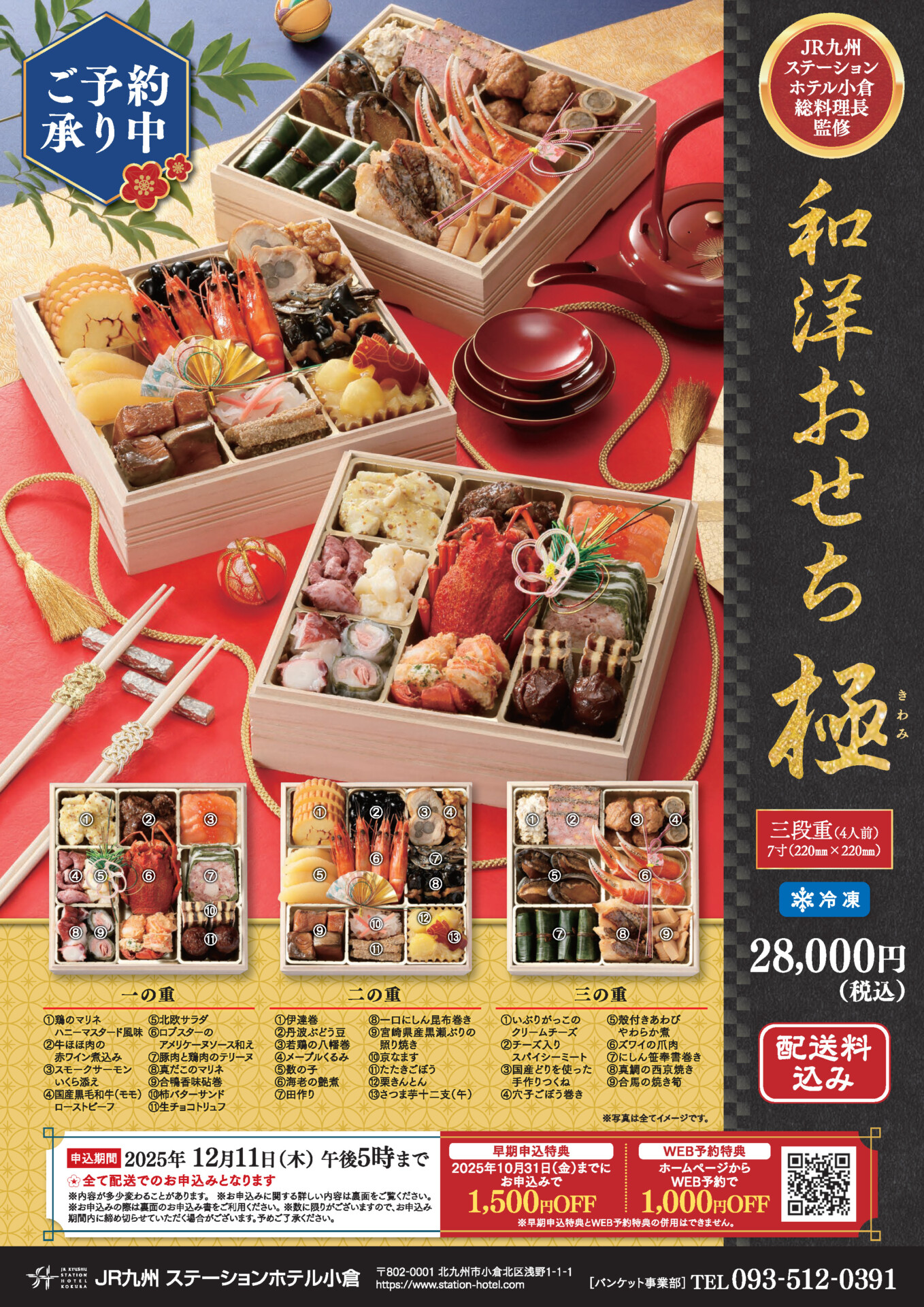 毎年ご好評いただいている 、JR九州ステーションホテル小倉監修「和洋おせち 極(きわみ)」 。今年もご予約を受け付けております。厳選した素材とホテル総料理長監修のレシピで作られた、彩り豊かな三段重の贅沢なおせち。ご家庭での団らんや、大切な方への贈り物にもぴったりです。