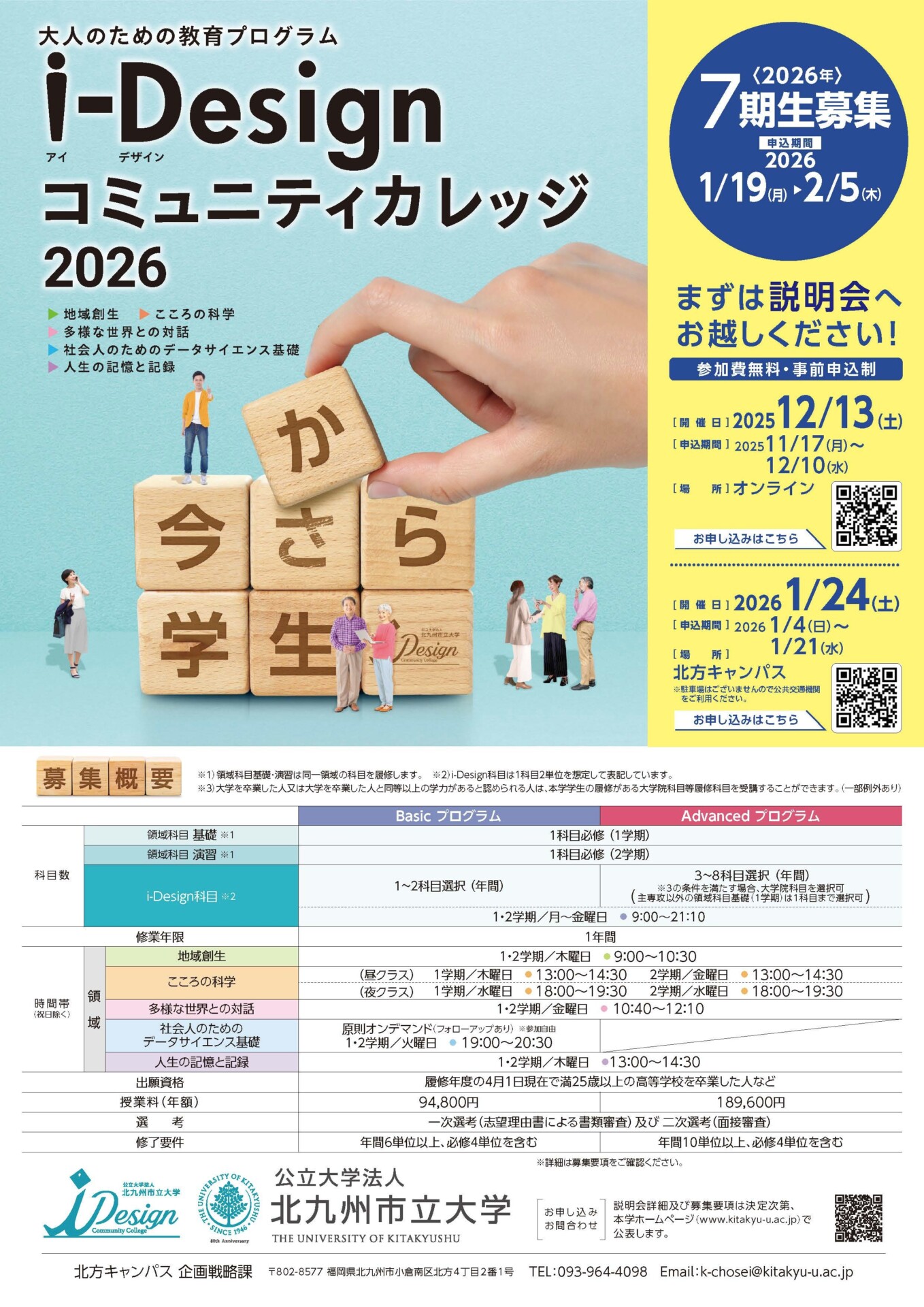 北九州市立大学では、社会人教育プログラム「i-Design(アイデザイン)コミュニティカレッジ」の2026年度履修生を募集します。社会人の皆様が、ご自身の“未来”を自らデザインするための「学びの場」を本学の知を活かして提供いたします。オンラインで説明会(事前予約制)を開催しますので、ぜひご参加ください!