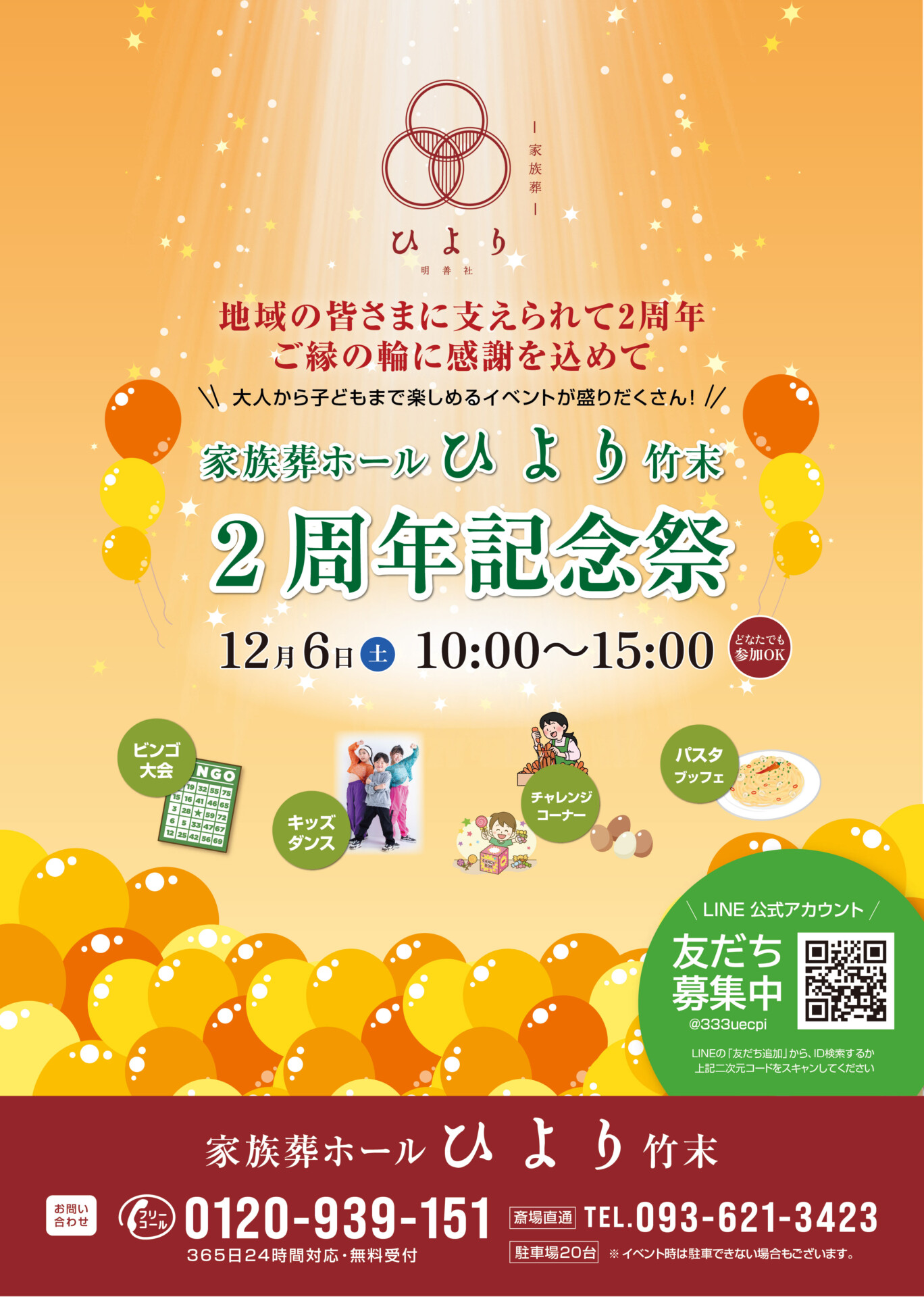 2025年12月6日(土)10:00~15:00、家族葬ホールひより 竹末にて「2周年記念祭」を開催いたします!