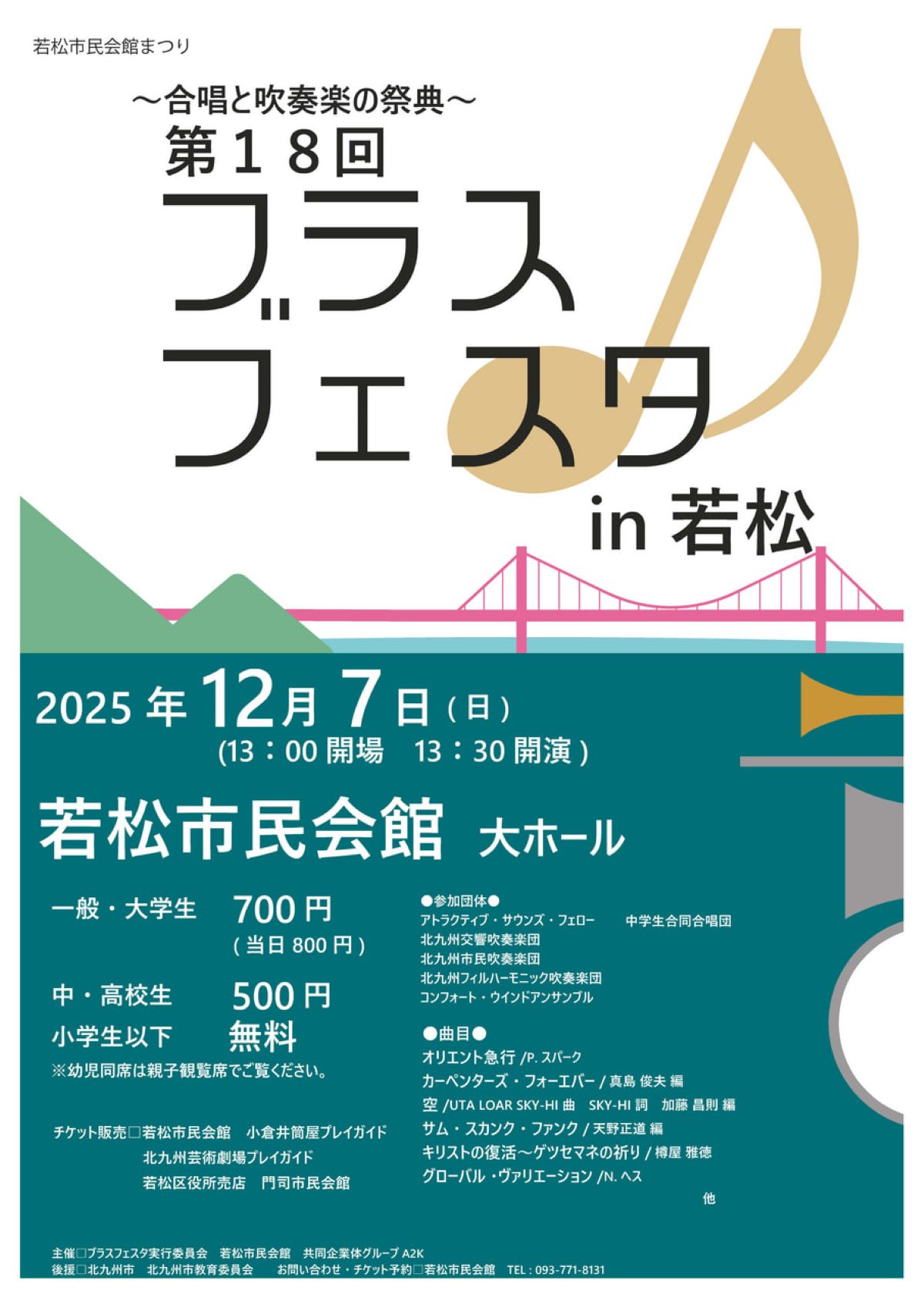 若松市民会館(北九州市若松区本町3-13-1)の大ホールで12月7日、若松市民会館まつり「第18回ブラスフェスタin若松」が開催されます。