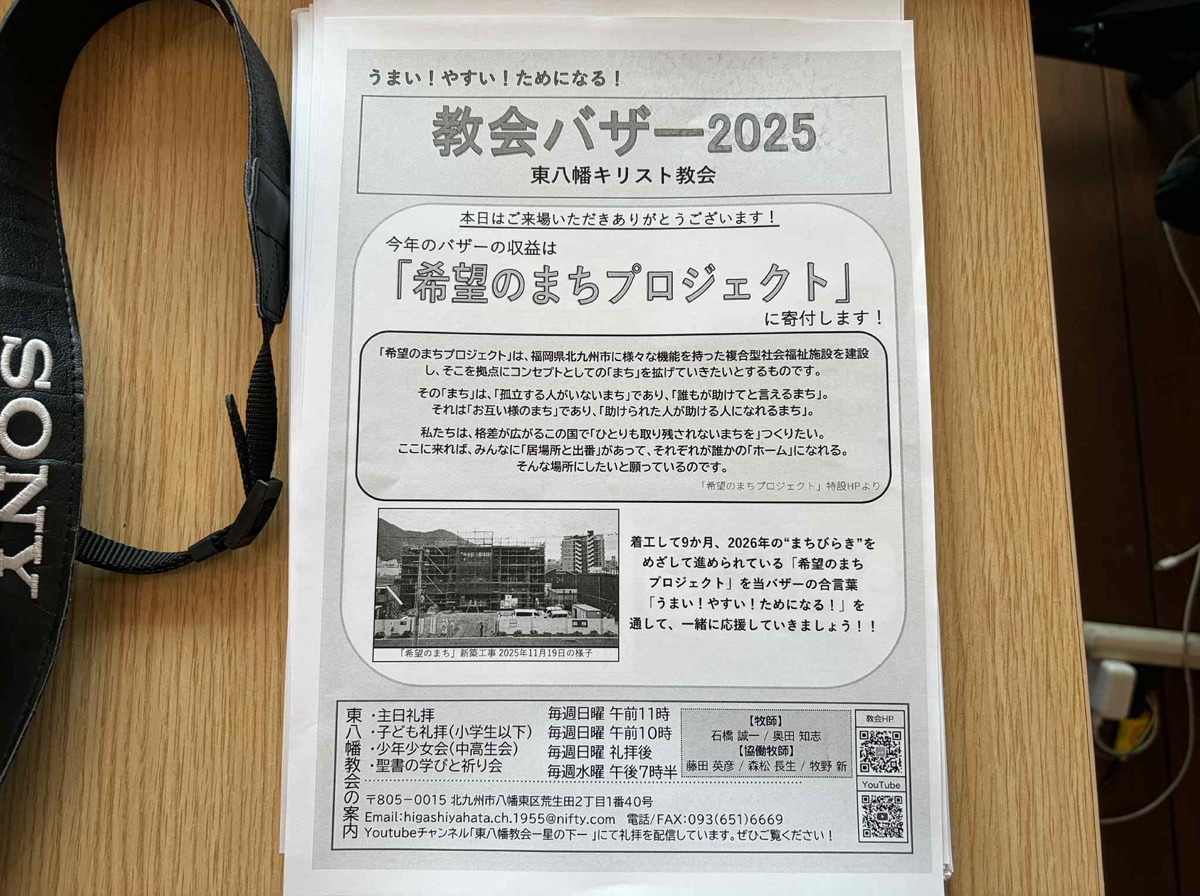 今年度のバザーの収益は、北九州市で奥田牧師らが進めている、さまざまな機能を持った複合型社会福祉施設を建設し、そこを拠点にコンセプトとしての「まち」を拡げていきたいとする<希望のまちプロジェクト>のために用いられるそうです。