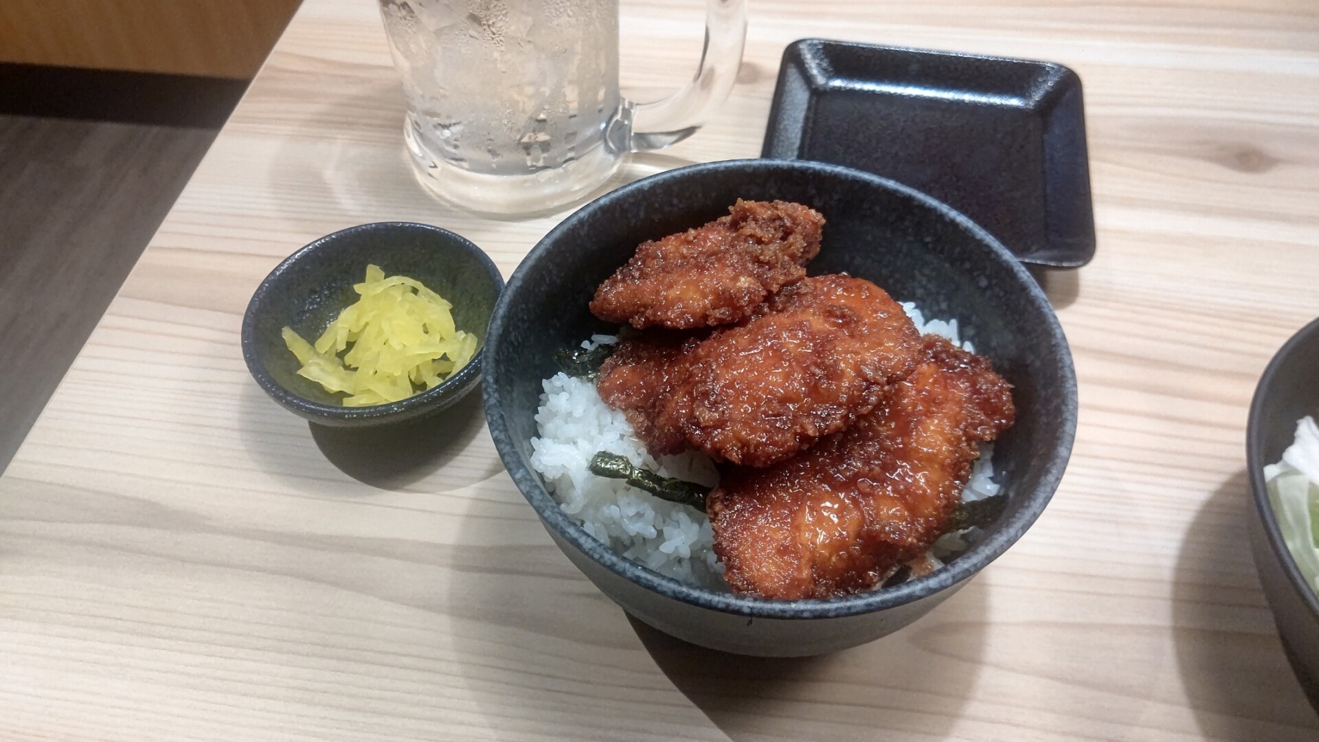ご飯が重たいという人にはご飯が付かない「鳥たれかつ丼の頭」があり、これは半熟卵に絡めて食べます。