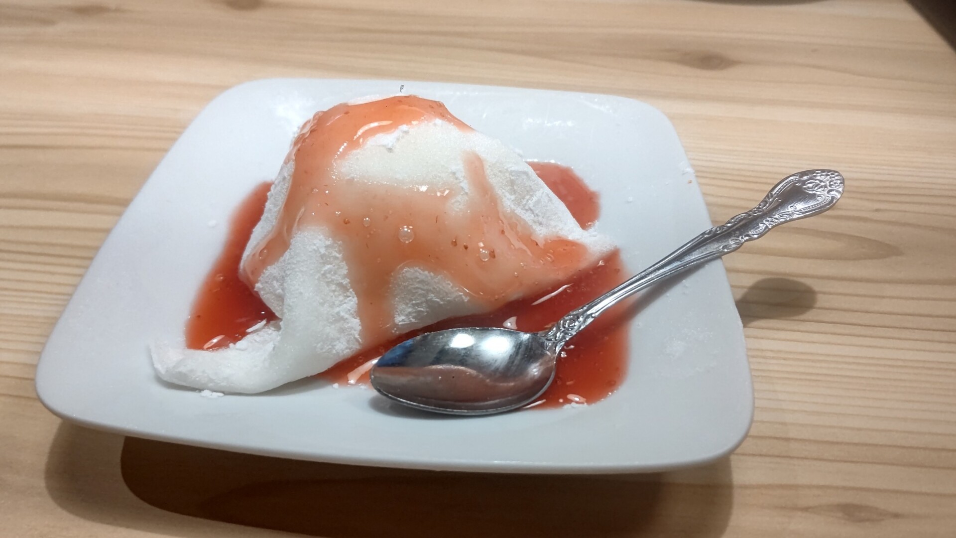 ヒラヤミルクアイスを“ぎゅうひもち”で包んで、国産苺シロップをかけたさっぱりしたデザートです。なお、他にもみたらし味がありました。