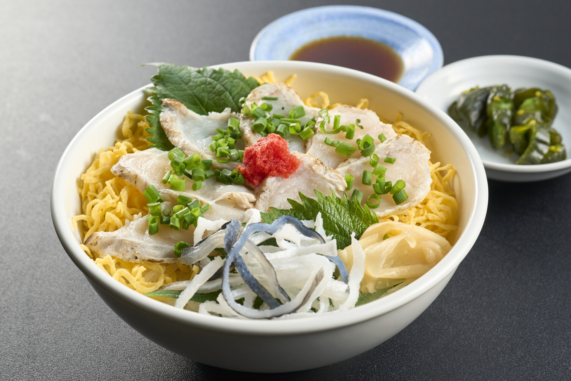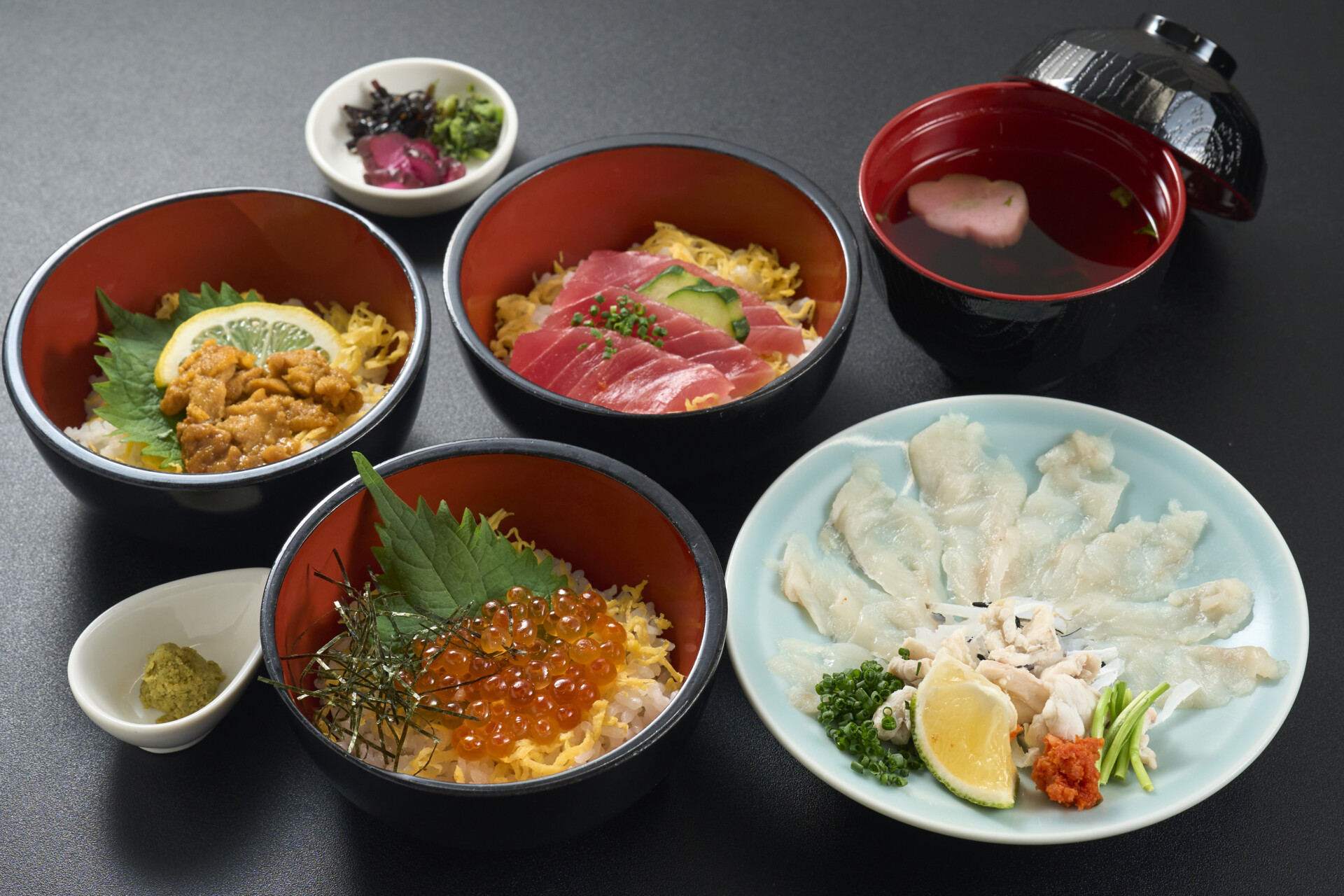 とらふくの刺し身と9種類の中から好きな丼を3つ選べ、自分好みに楽しめる「三択ミニ丼セット」(2800円)です。ミニ丼3種にふく刺し、お取い物、香の物が付いています。