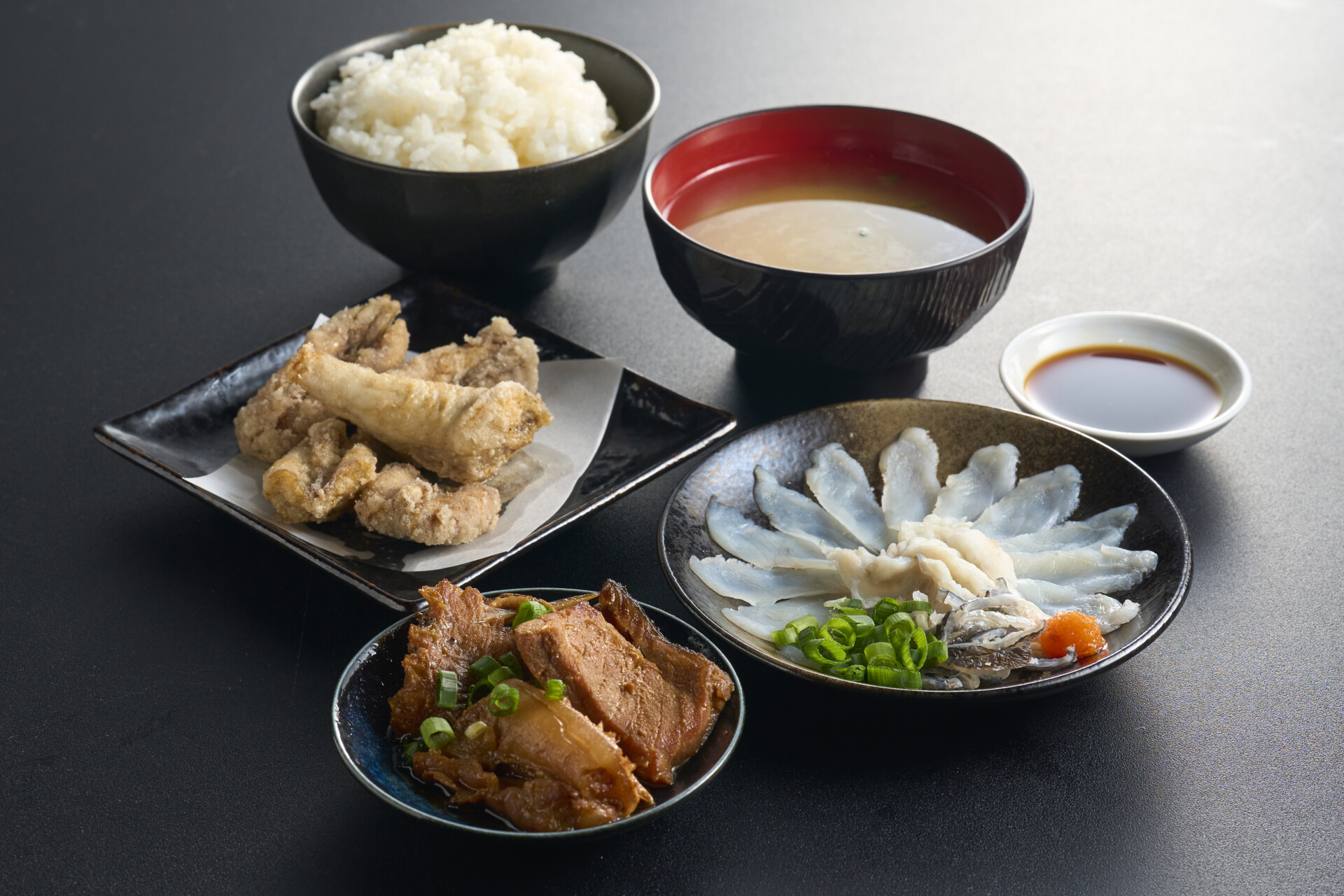ミニふく刺し付きの「ふく唐揚げ定食」(2000円)。さらにふく汁もついて、ふくの揚げ物を3種(唐揚げ・天ぷら・フライ)楽しめる定食です。