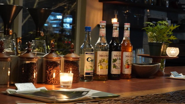 カウンター席には、コーヒーブリュワーや豆のほか、リキュールがインテリアのように美しく並びます。今後はお酒の提供も予定しているのだとか。