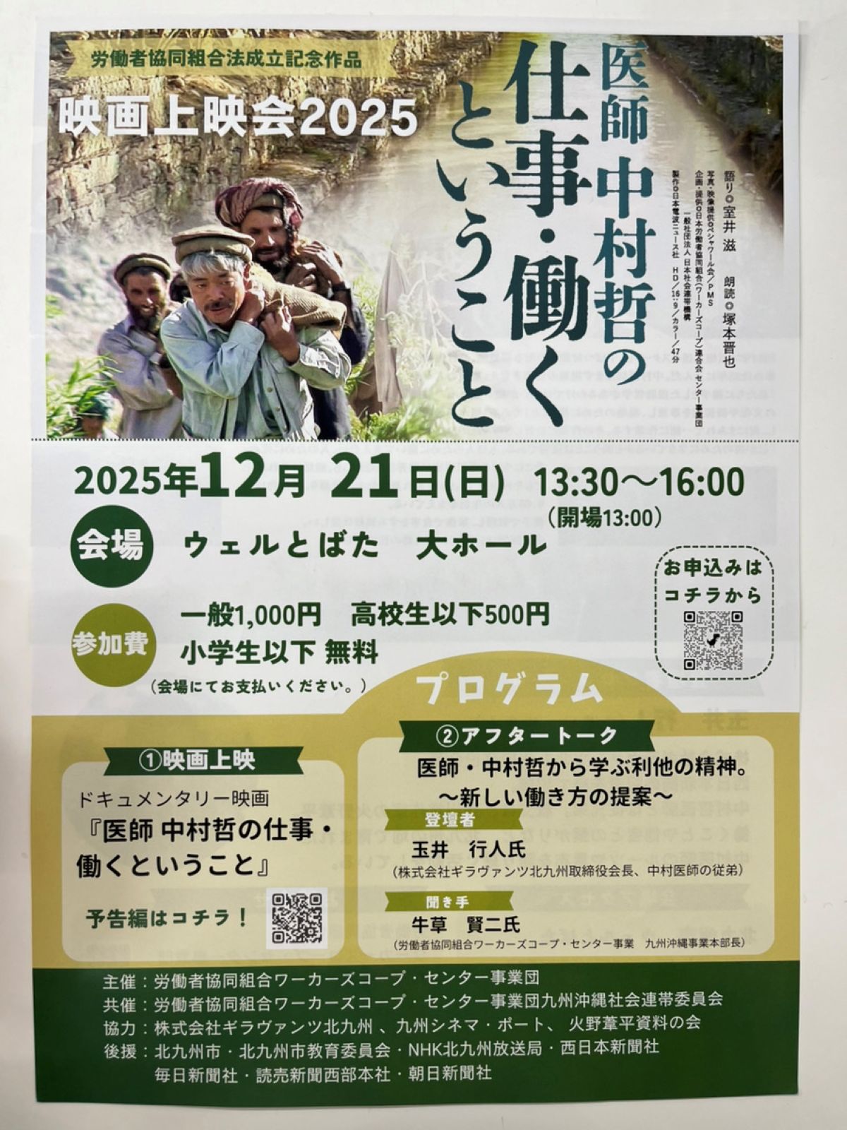 ウェルとばた(北九州市戸畑区汐井町1-6)の大ホールで12月21日、映画『医師中村哲の仕事・働くということ』の上映会&講演会が開催されます。