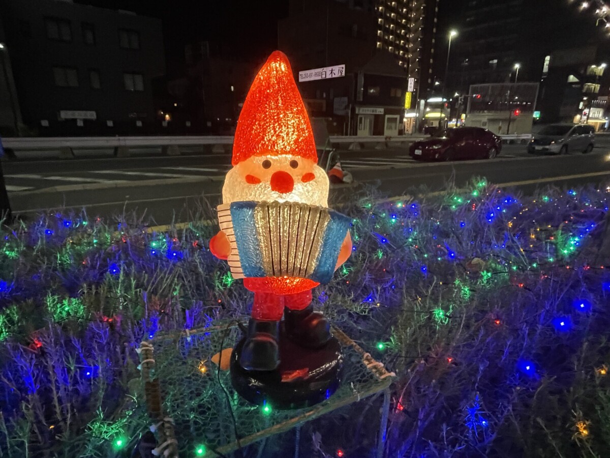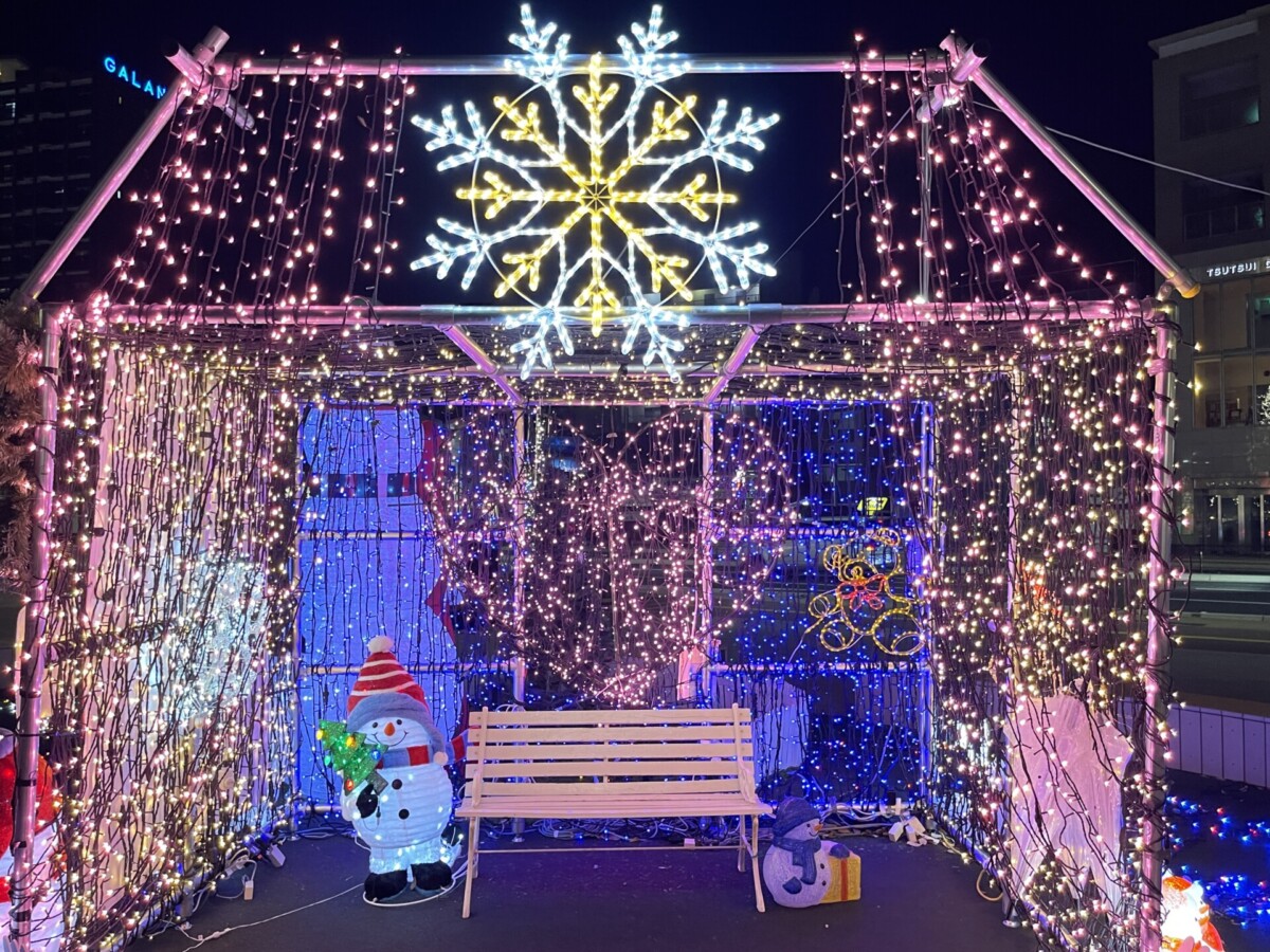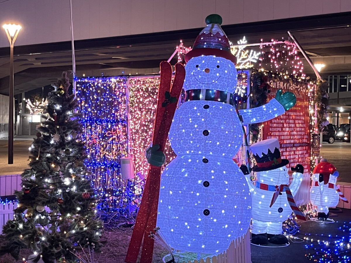 大小の雪だるまが手をあげてキラキラと輝き、その横にはクリスマスツリーなども設置。地面には、青・赤・緑などたくさんの色に彩られた電球が点灯していました。