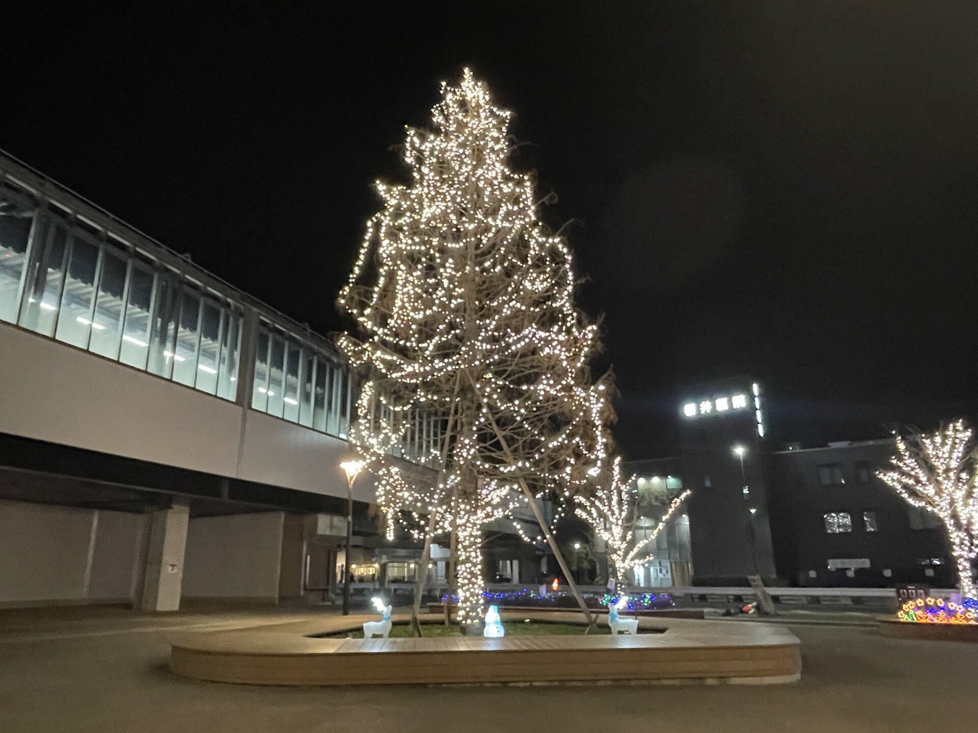折尾の冬の風物詩でもある「折尾イルミネーション」。令和5年4月に完成した折尾駅北側駅前(学園大通り口)広場に今年も設置されています。