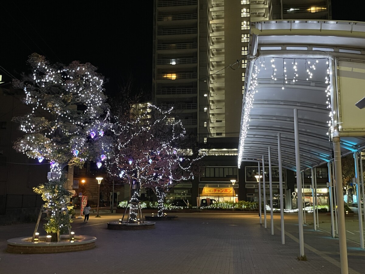 JR八幡駅前や国際通りにて、イルミネーションの点灯が開始しています。期間は、2月26日までです。