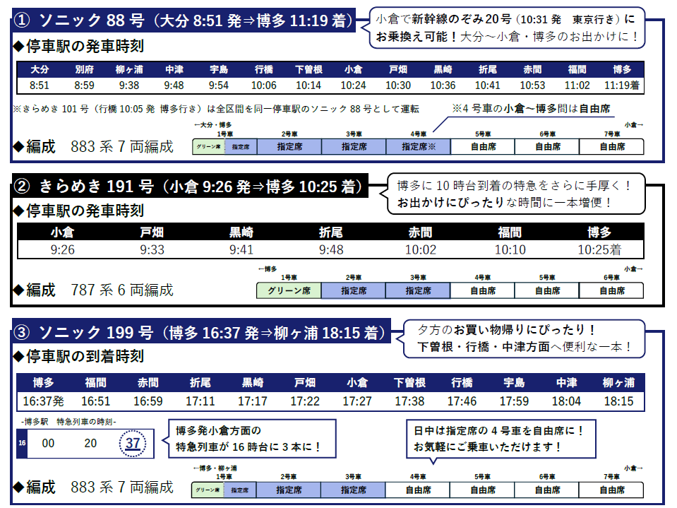 臨時列車は、ソニック88号(大分午前8時51分発、博多午前11時19分着)とソニック199号(博多午後4時37分発、柳ヶ浦午後6時15分着)、きらめき191号(小倉午前9時26分発、博多午前10時25分着)です。