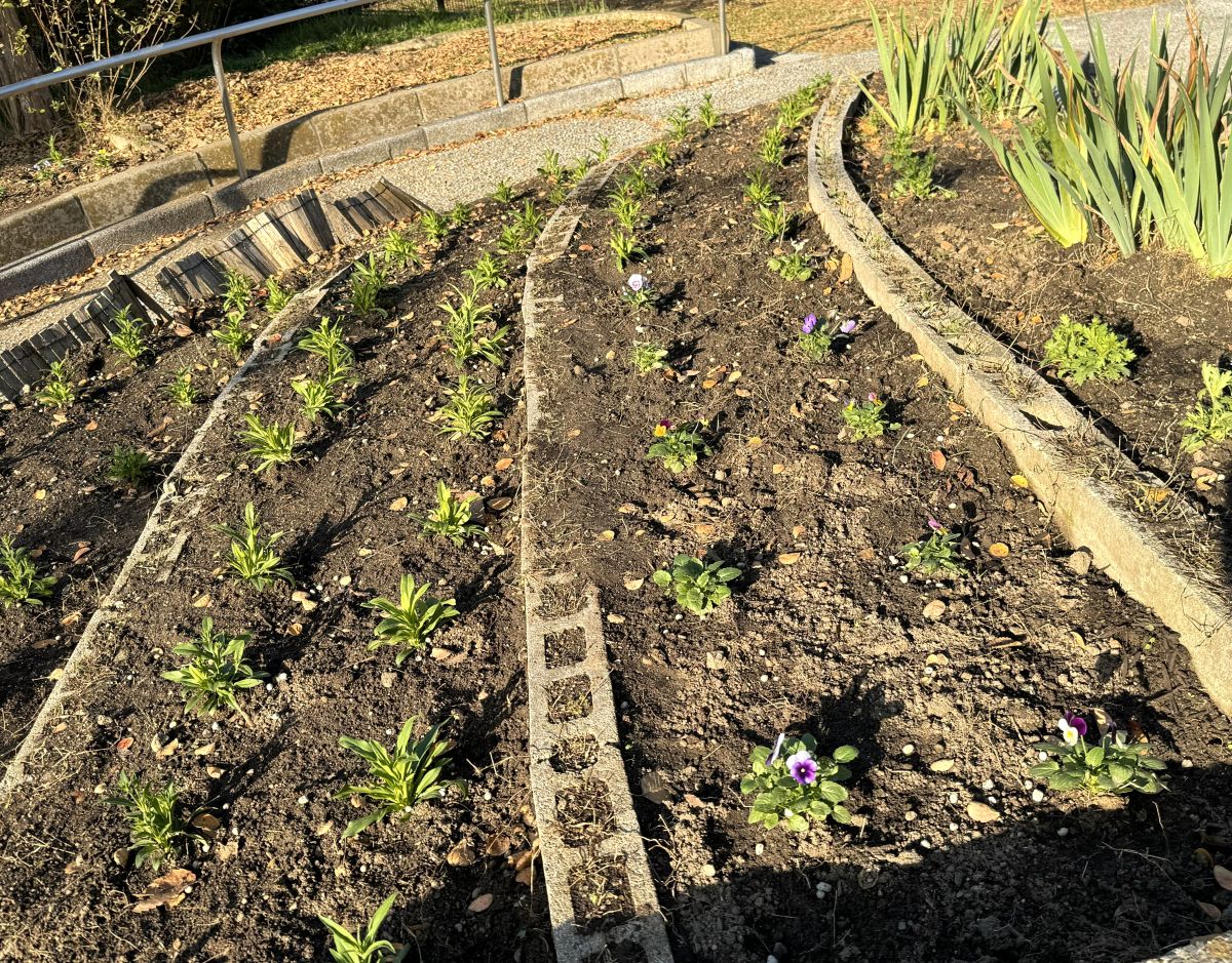 花壇には花が植えられ、丁寧に手入れされている様子がうかがえます。