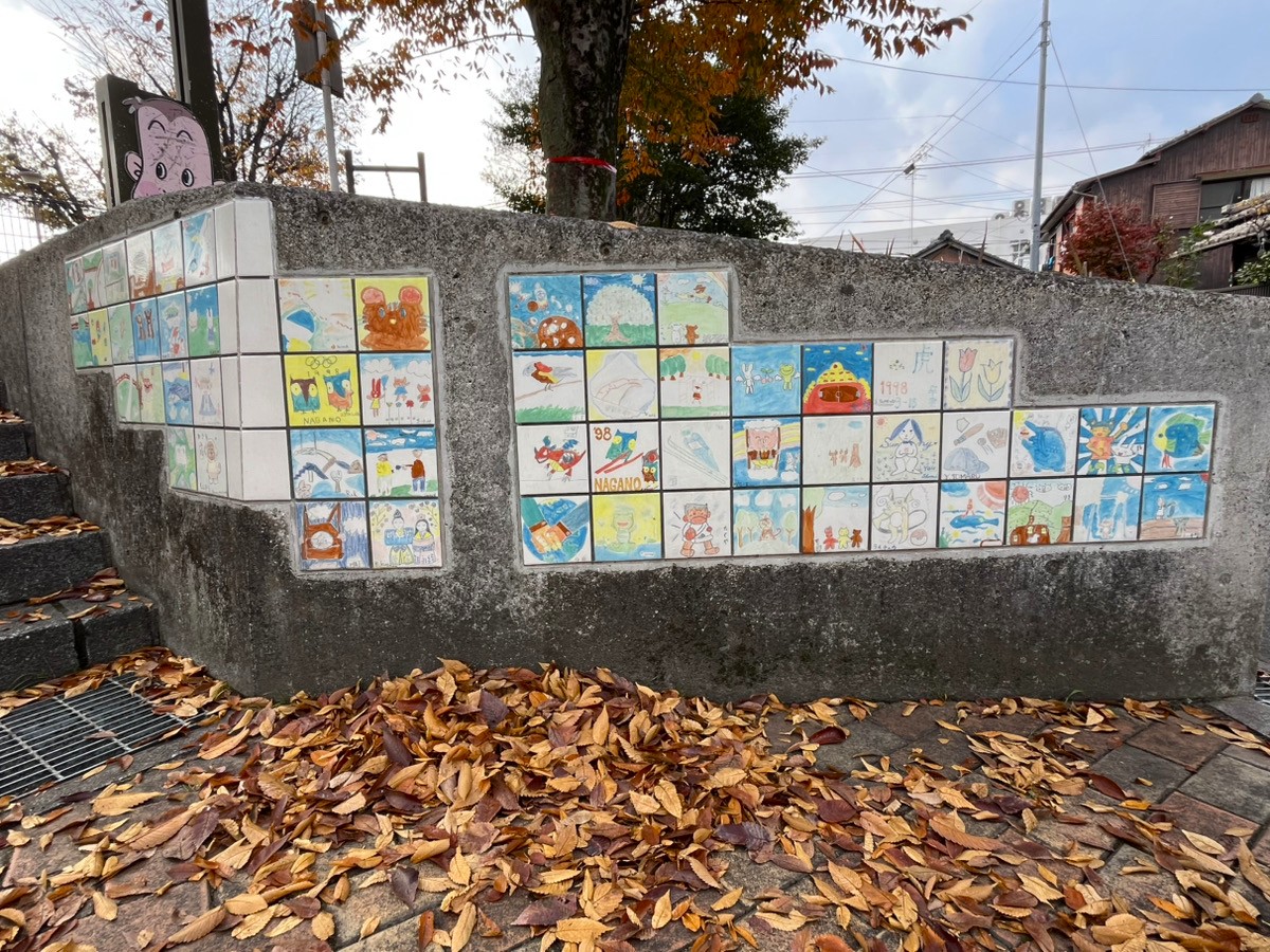 また、子どもたちが描いた陶板タイルがびっしりと貼られており、「1998年」「長野オリンピック」といった文字から、今から約27年前の作品ではないかと推測。そうであれば、描いた子どもたちもすっかり大人になっていますね。