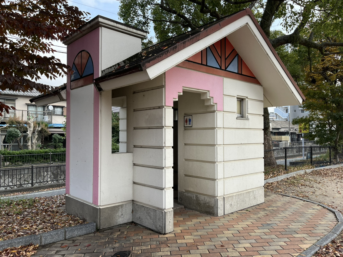 家の形をしたトイレは、やさしい色合いで親しみやすいデザイン。