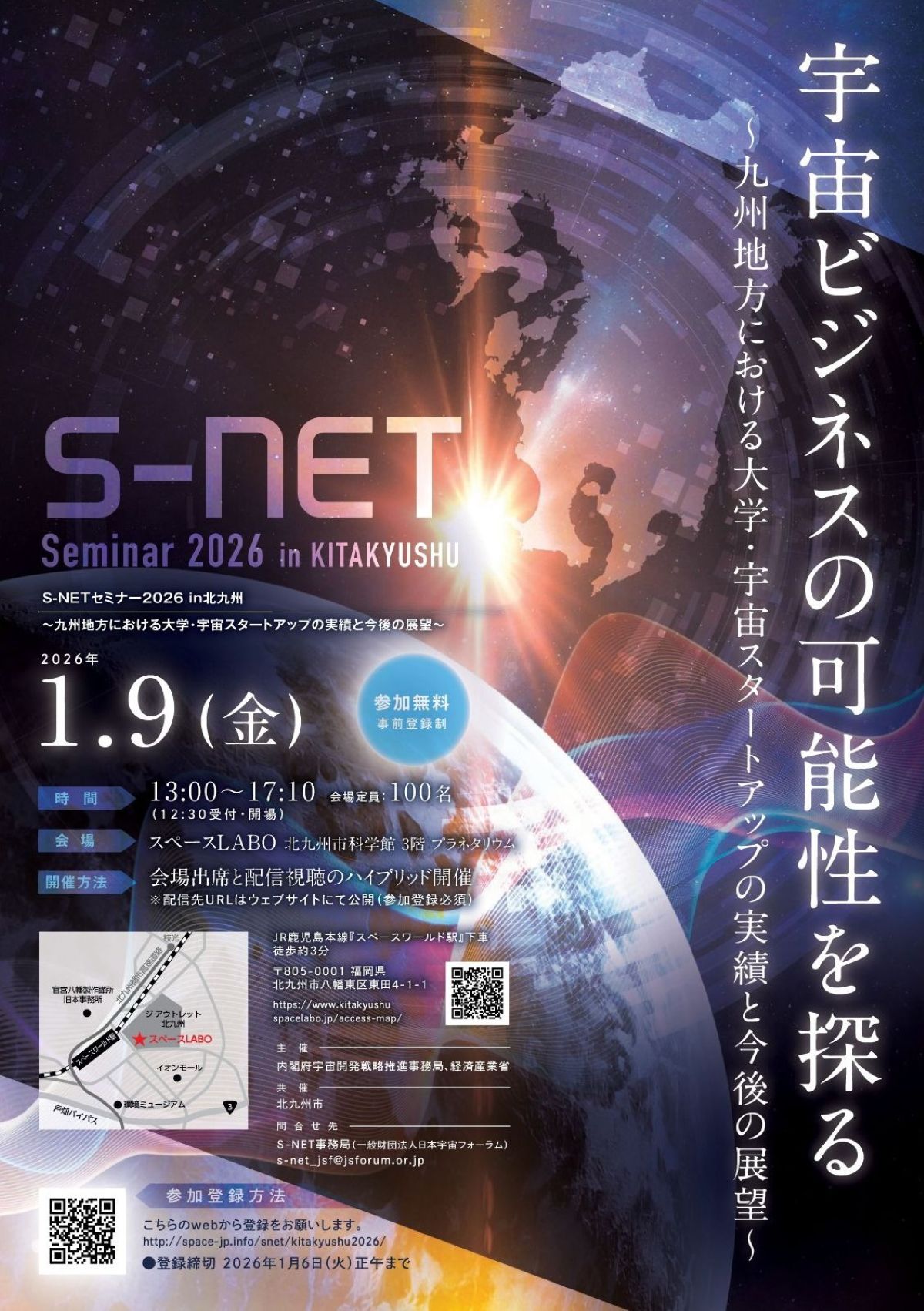 スペースLABO(北九州市八幡東区東田4-1-1)3階・プラネタリウムで1月9日、宇宙ビジネスの可能性を探るセミナー「S‐NET セミナー2026 in 北九州」が開催されます。
