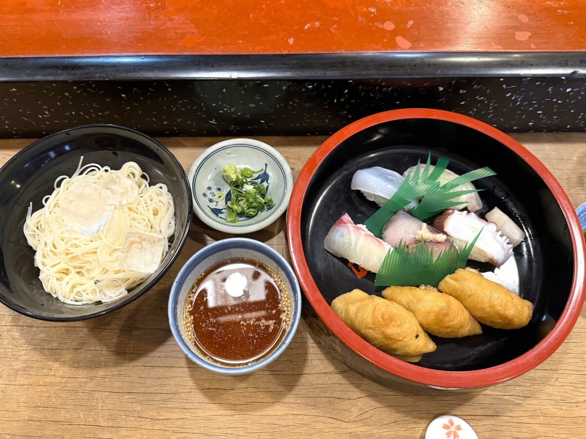 この日のランチは、鯛・サバ・ヒラマサ・タコ・イカの握り5貫に、いなり寿司3個、そして冷そうめんがついて1000円(税込)。