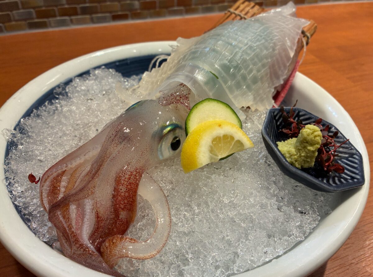 小倉で活きイカの姿造りが食べれるお店は少なく、透明感あるコリコリした切り身が提供されます。