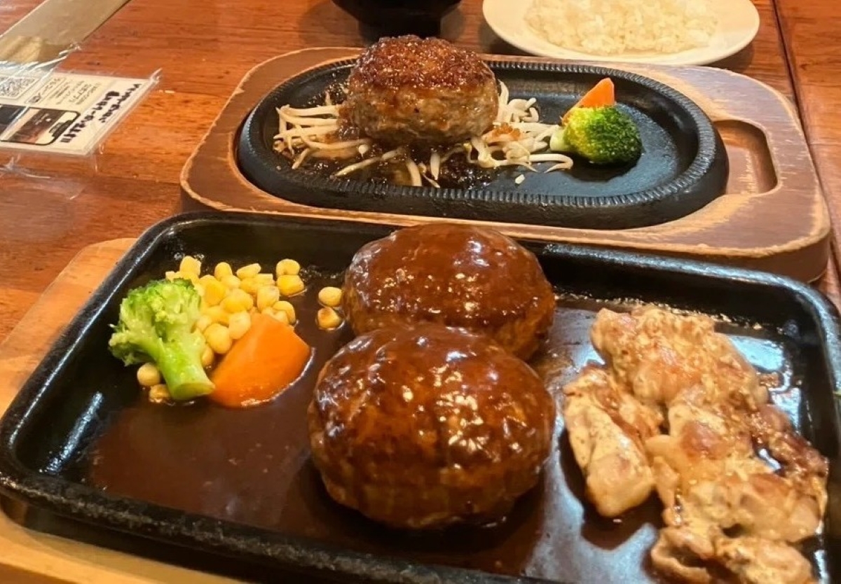 ハンバーグ&チキンのダブル(1936円)をオーダー。付け合わせは、人参、ブロッコリー、コーンです。ハンバーグにはデミグラスソースが添えられ、チキンは醤油ベースの甘辛風味でご飯がすすむ味付けです。
