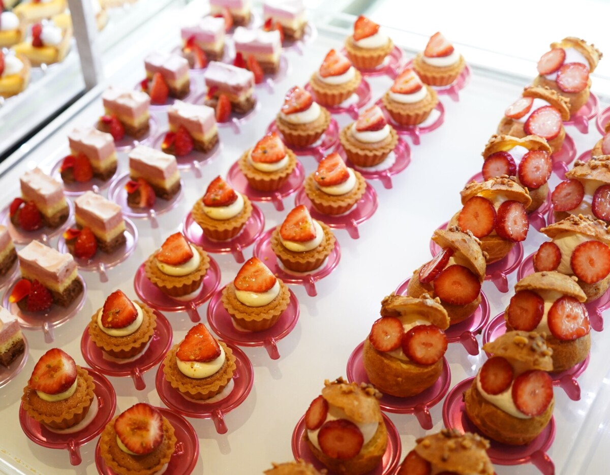 ビュッフェコーナーでまず目を引くのは、まるで宝石箱のようにディスプレイされた色とりどりのいちごスイーツ。