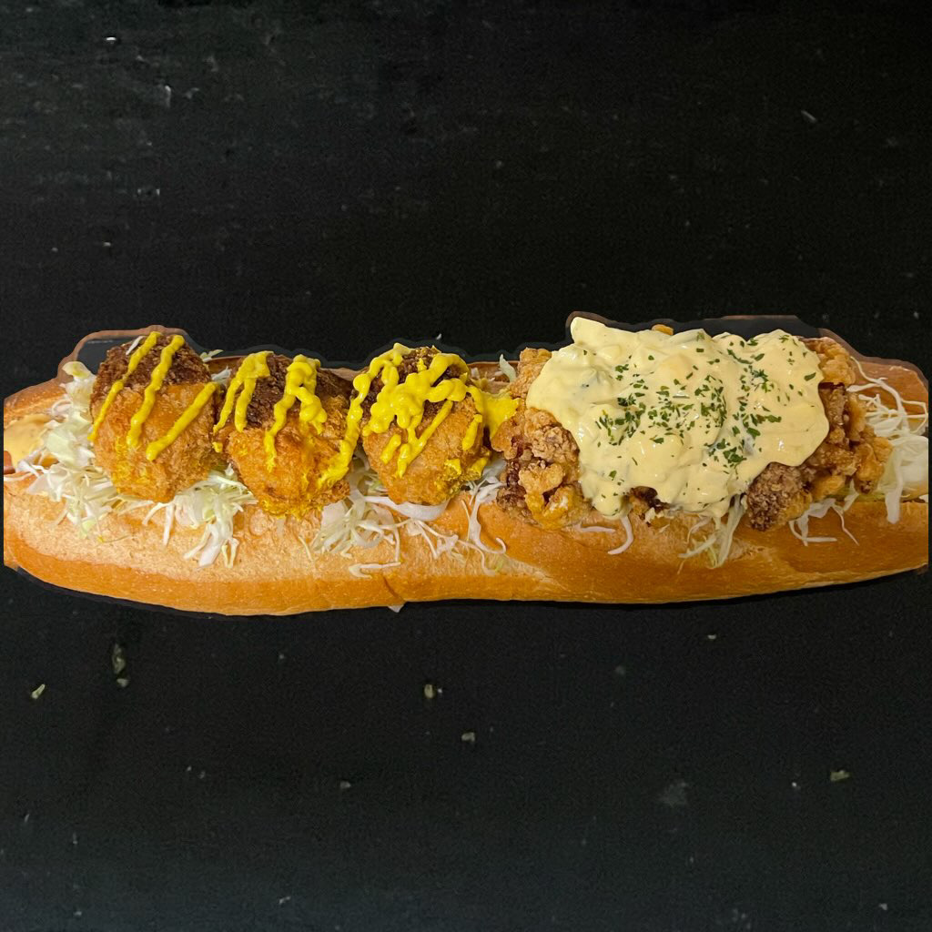 (画像は「ザ・ギガドッグ」のタルタルチキン&ひれカツ<1950円>)全長30cm超えという衝撃的な大きさのパーティーメニュー。中の具材をたまご・チーズ・タルタルチキン・ひれカツの中から2品選ぶことができ、ドッキングするという豪快な一品です。