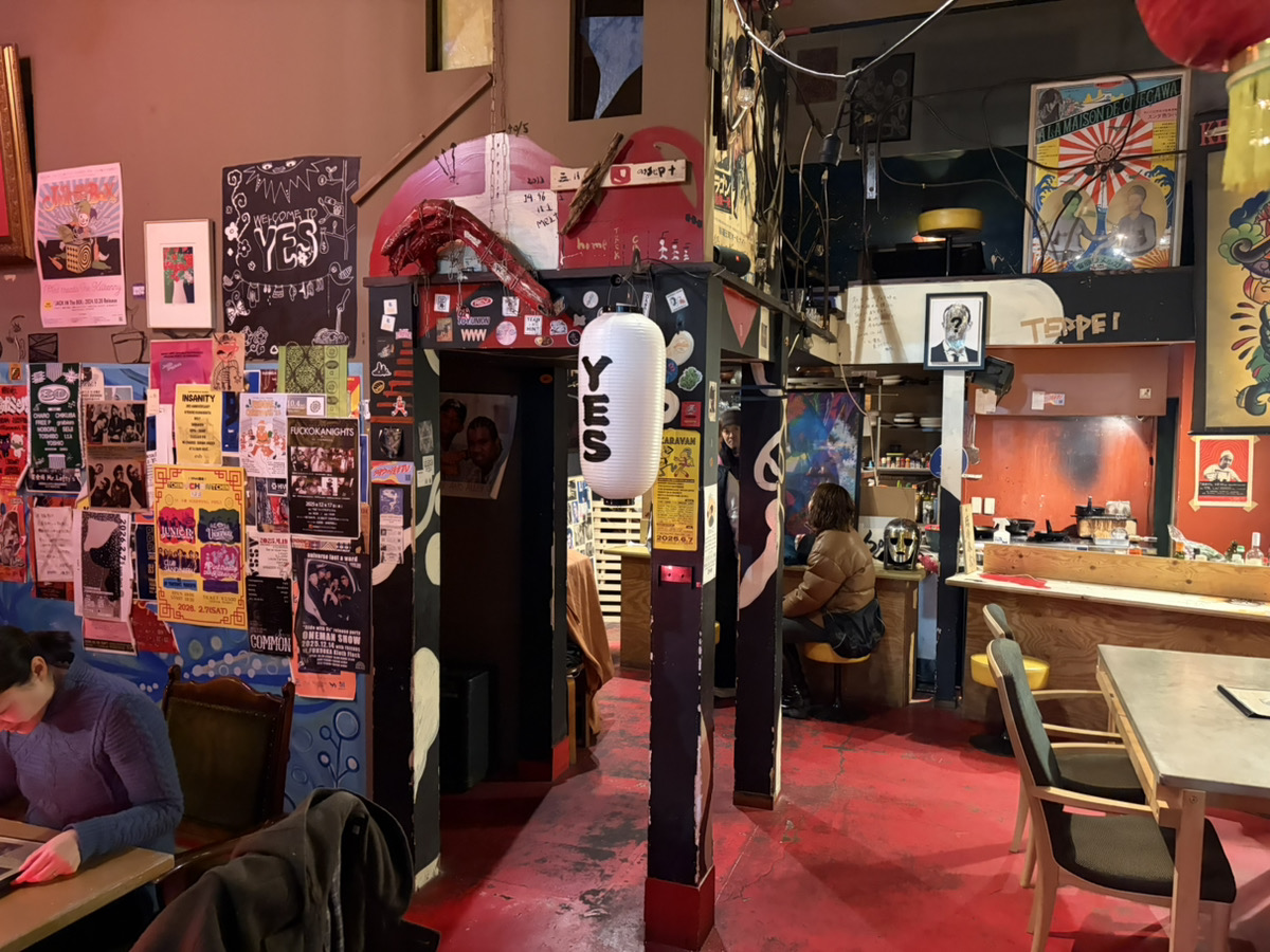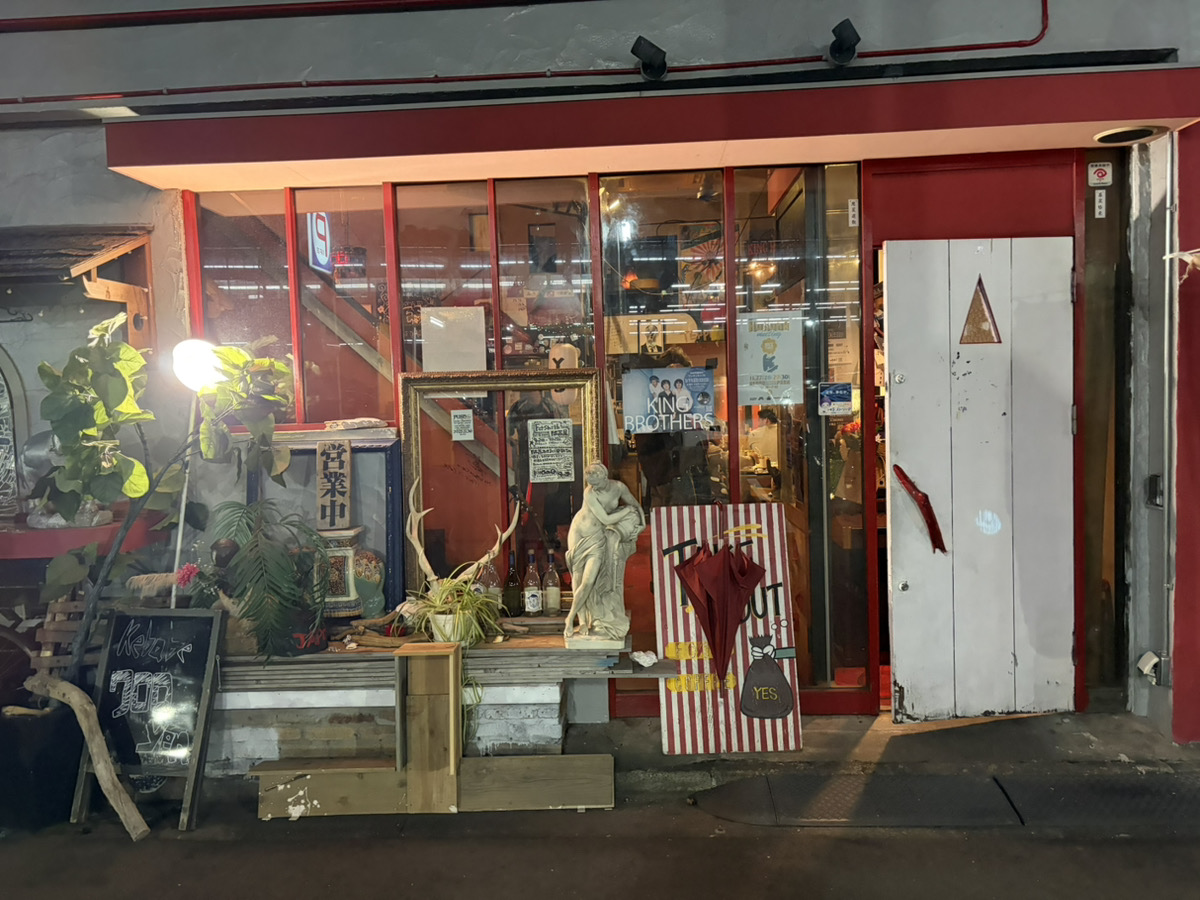 小倉駅そば、赤を基調とした店舗の中に入ると、色とりどりのチラシやポスター、絵が飾られた混沌とした雰囲気に圧倒されます。