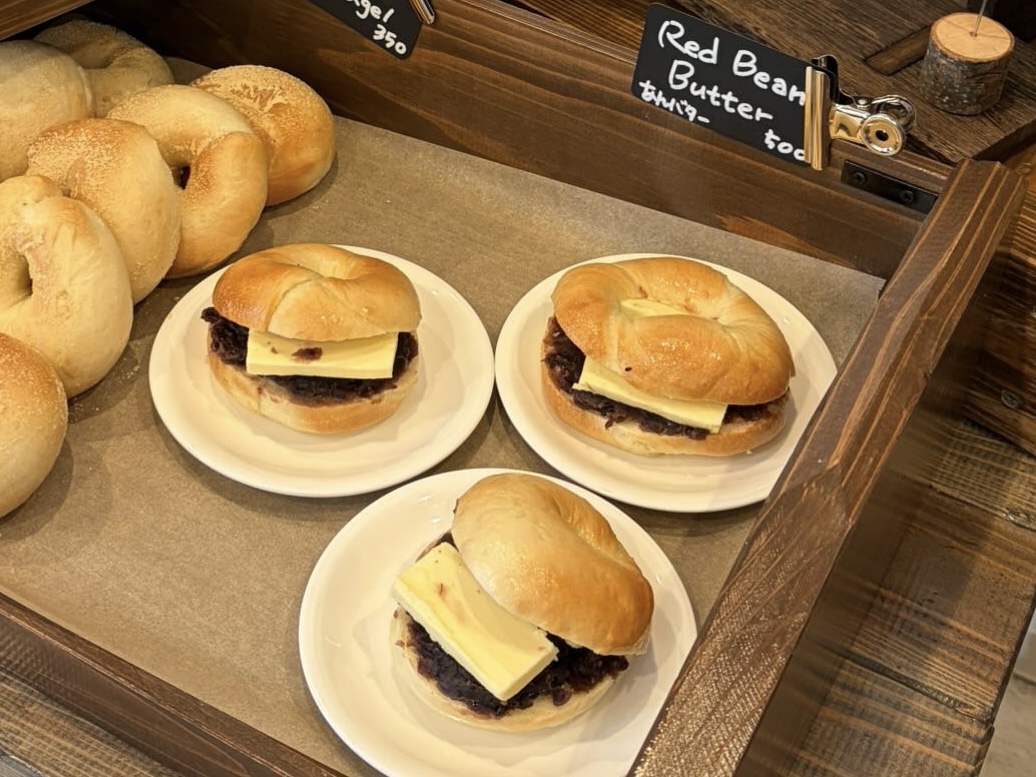 (画像はあんバターベーグル)つぶあんのやさしい甘さと、バターのまろやかなコクが絶妙に合わさった一品です。
